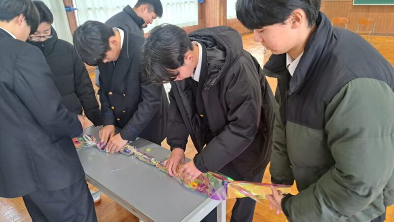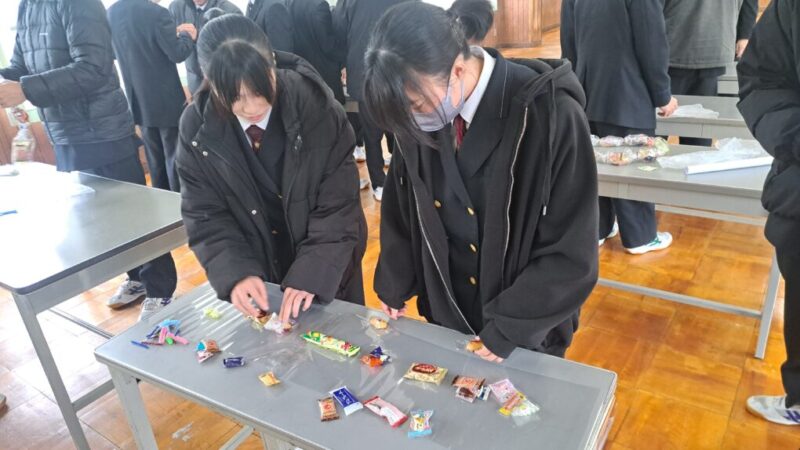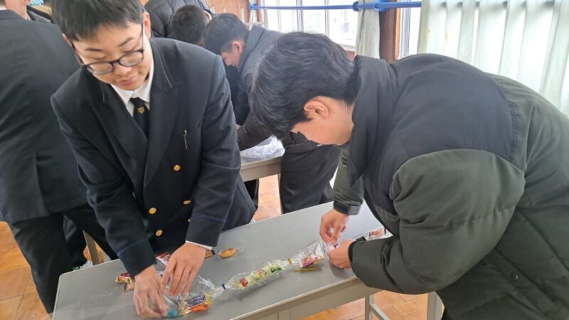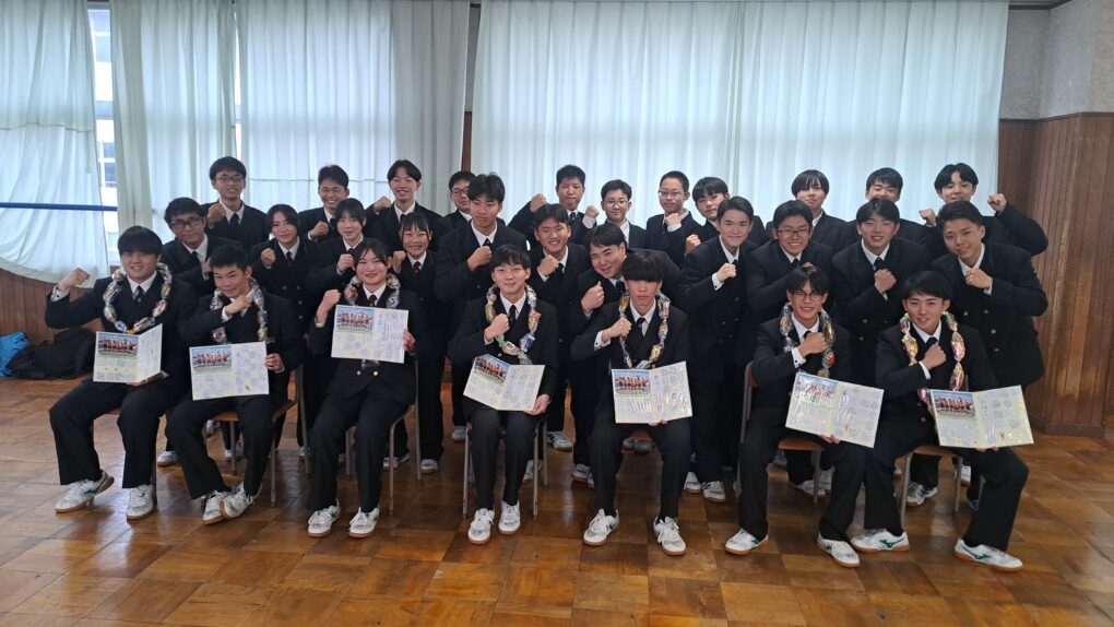 1・2年生が感謝の気持ちを込めて作った色紙とキャンディーレイ(お菓子のネックレス)を手渡しました。3年生からは、3年間の思い出や後輩へのメッセージが述べられました。