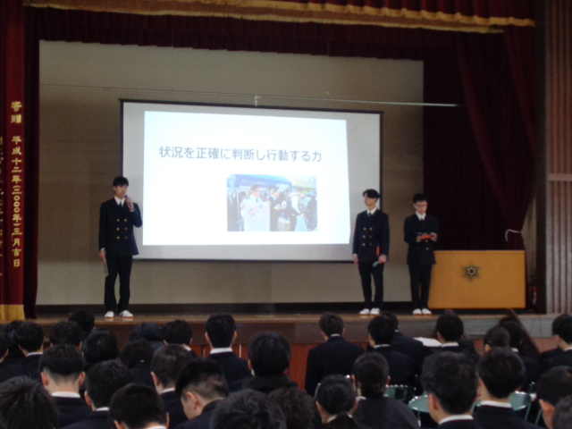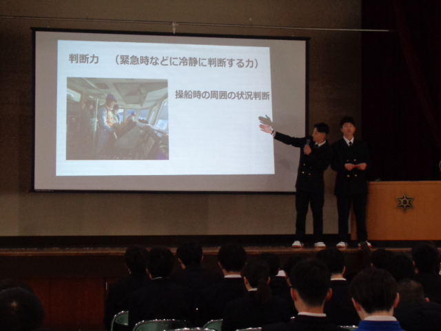 海洋科学科内で実施した予選会で選出された2グループの代表班が、発表題「海上保安官への第一歩」及び「広がる世界、広がるチカラ」について発表を行いました。