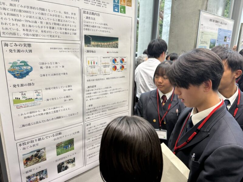 ポスター発表では、森里海連環学に関する本校の取組について発表することで、プレゼンテーション能力の向上に加え研究活動の方向性やヒントを得られるきっかけとなり、持続可能な社会について考える機会とすることができました。