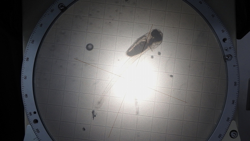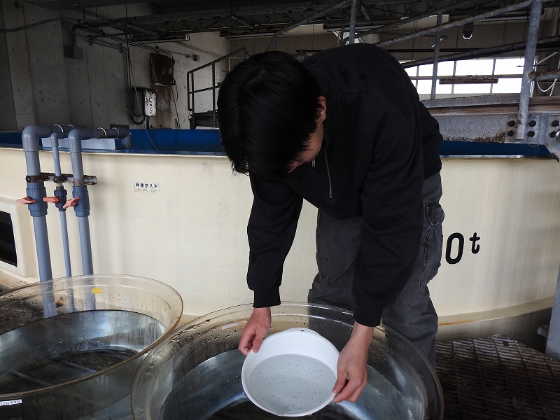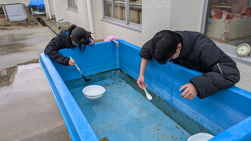 【マリンバイオ部】アユカケ採卵・ふ化 2026№2 マリンバイオ部 2026.03.13 アユカケの孵化が始まりました。 2月20日(金) 受精卵を守り、世話をするオス。※親魚は福井県産 3月5日(木) アユカケ孵化開始黒い粒がアユカケの孵化仔魚です。 孵化仔魚回収 アユカケ孵化仔魚5日~7日の期間に約1300個体の孵化仔魚を回収しました。 収容 孵化仔魚 全長測定 孵化仔魚 平均全長6.6㎜マリンバイオ部では、2016年に初めてアユカケの自然採卵と孵化に成功しました。翌、2017年にも成功しています。 2017年3月 繁殖に用いたオス個体(2016年の繁殖に用いた個体)※京都府産:飼育・管理に関して特別な許可を得ています。 2017年5月 この年に生まれたアユカケの稚魚2016年に続き、稚魚の一部を丹後魚っ知館(現在閉館)に提供しました。 Post Views: 3
