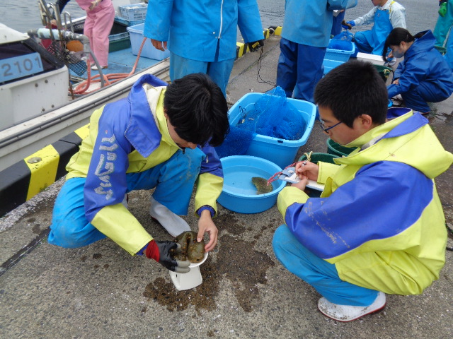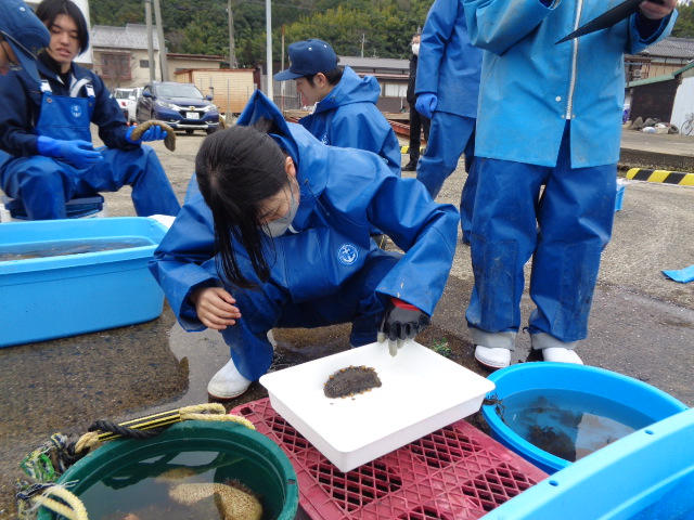 3月18日(水)、宮津なまこ組合、京都府漁協及び京都府水産事務所様が、宮津湾のマナマコ生息域調査を実施され、1年生も含めた海洋科学科の希望生徒8名が調査の補助員として参加しました。