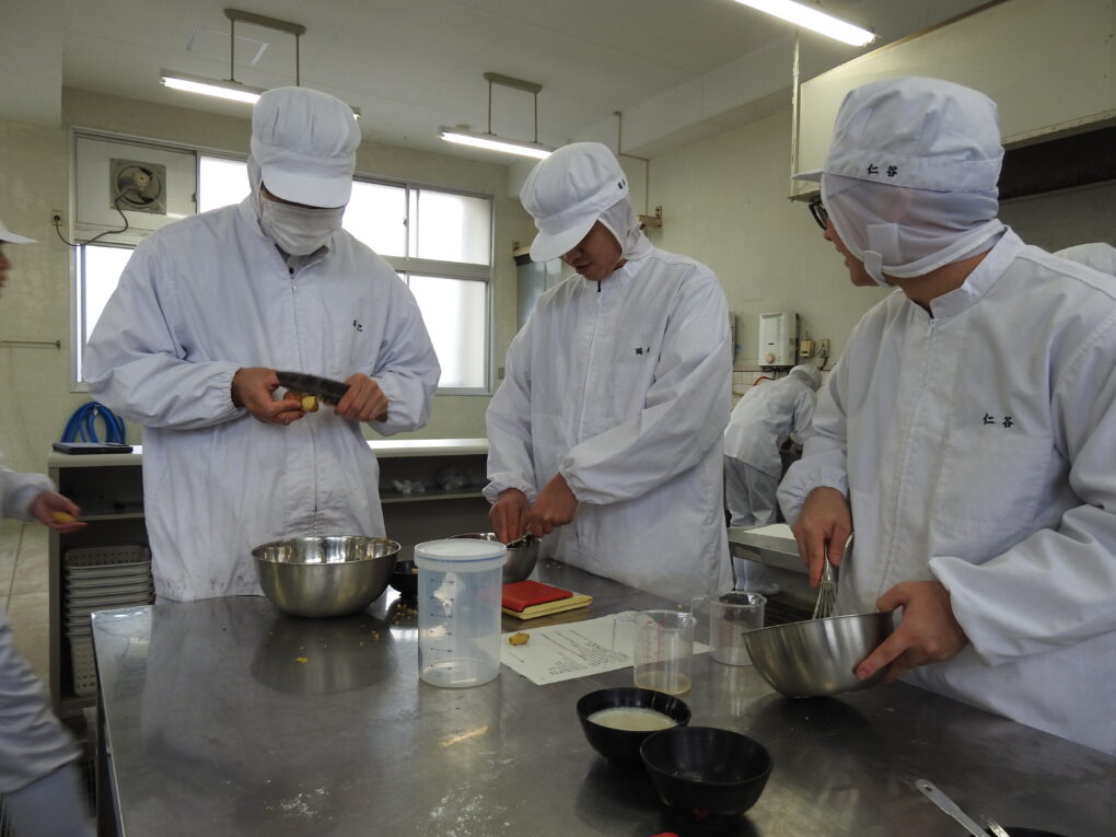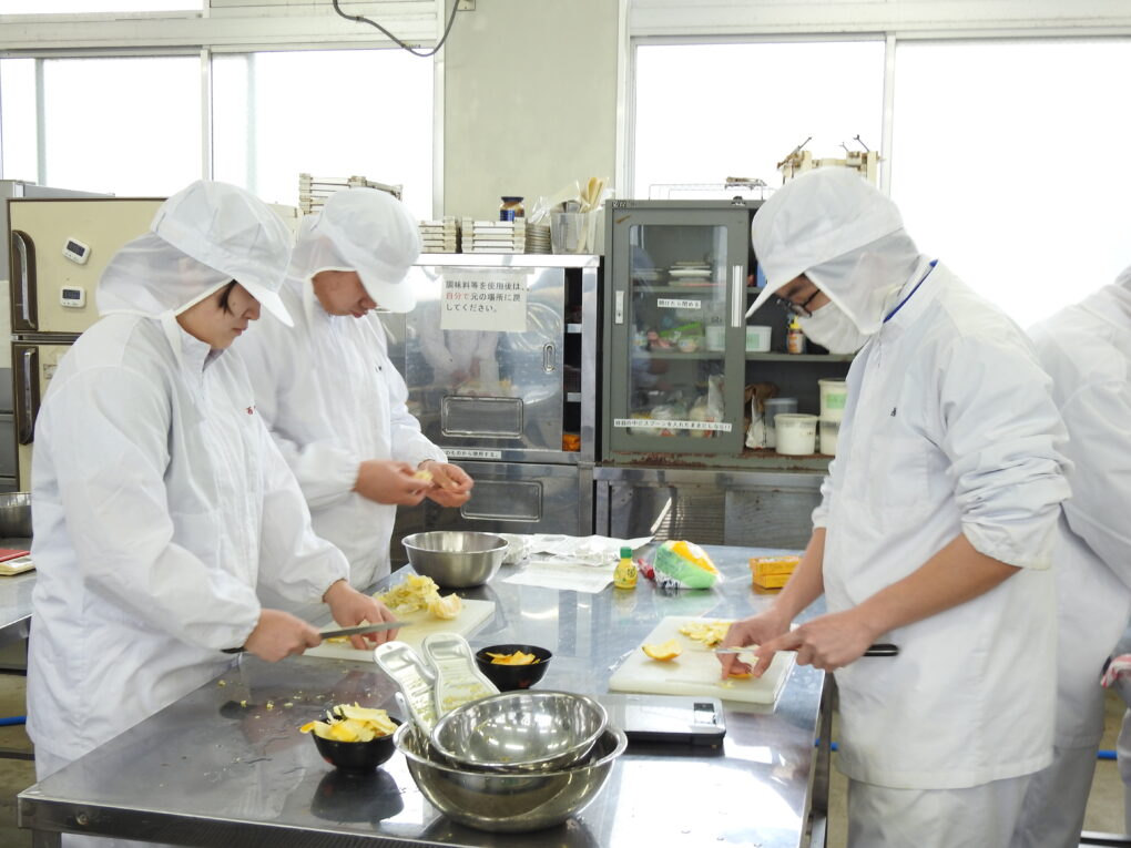 食品経済コース 3月12日(木)、食品経済コース2年生の「総合実習」において、地元の生姜、夏みかんを活用して製造実習に取り組みました。