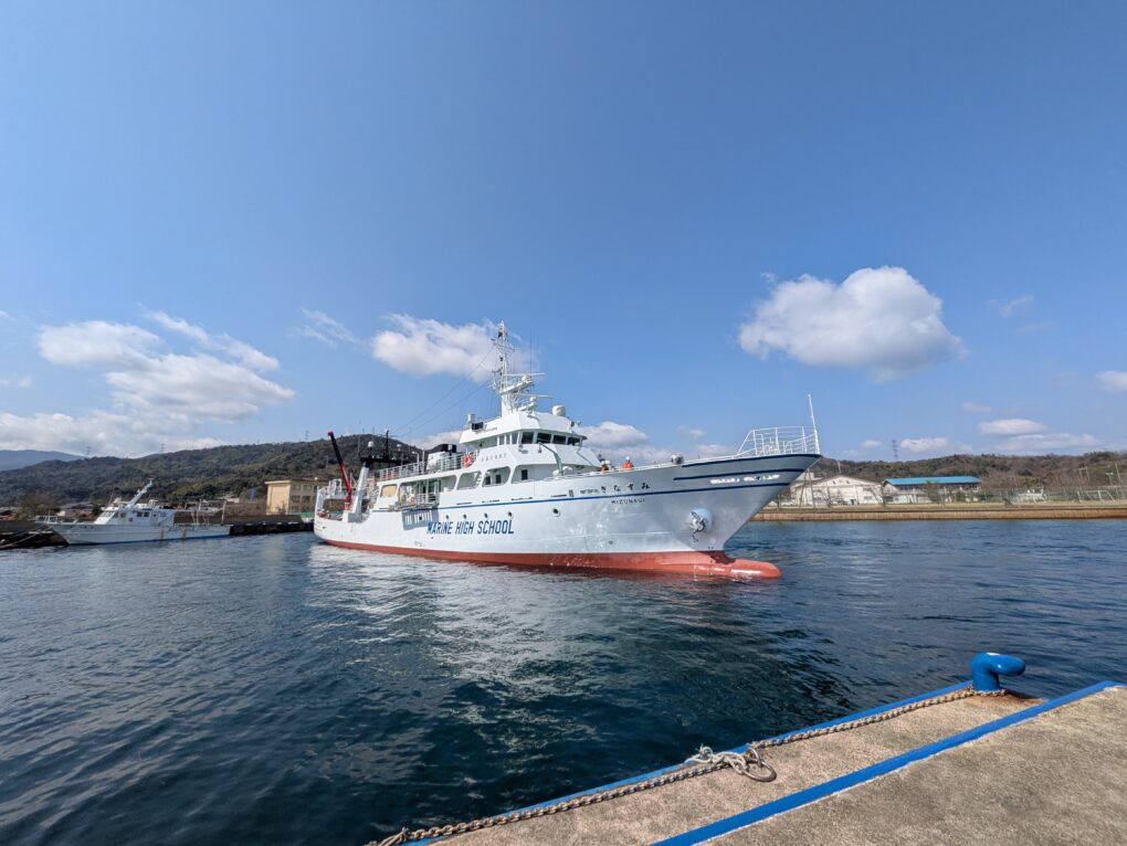 3月27日(金)朝、3月10日(火)に出航して以来、山口県での約3週間に及ぶドックを終了した実習船「みずなぎ」が、本校岸壁に還ってきました。(後進着岸中)