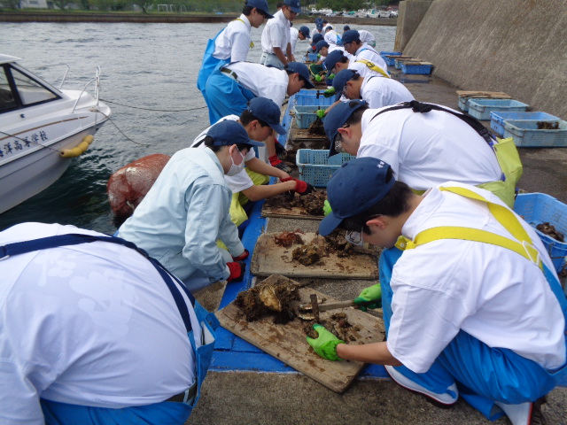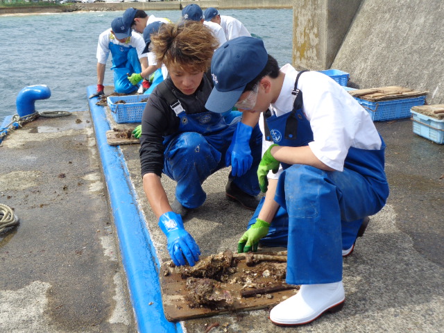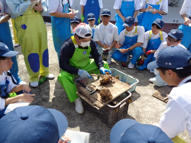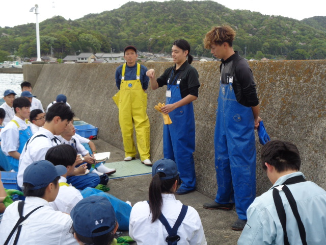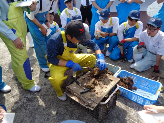 4月20日(月)、本校桟橋において海洋科学科2・3年生が、京都府漁業士会 相談役 小倉耕平 氏、青年漁業士 改發匡恒 氏、河畑貴政 氏及びコーディネーターとして京都府水産事務所海のにぎわい企画課 技師 齋藤一樹 氏を講師にお迎えし、漁業士交流会(イワガキ)をお世話になりました。