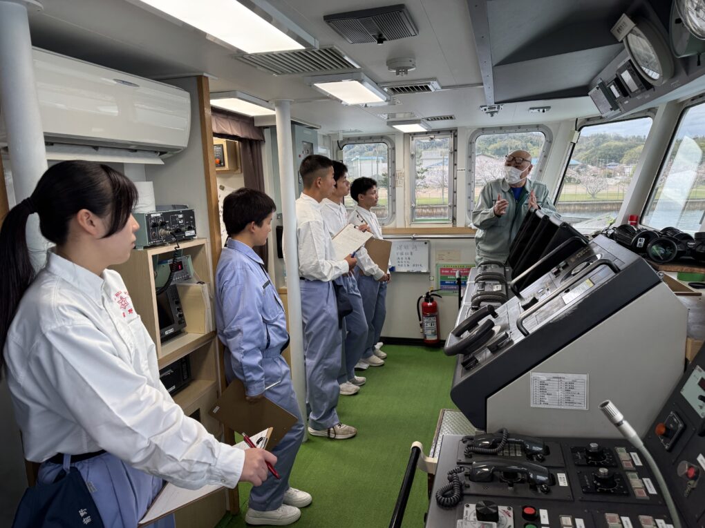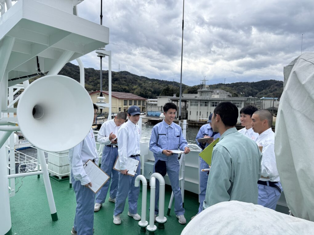 4月10日(金)、航海船舶コース3年生14名が「総合実習」において実習船乗組員から訓練記録簿の項目に関わる説明を受けました。船体やプロペラの構造について実物や写真を見ながら説明を受けることで、より理解を深めることができました。