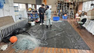 実習船 刺網修理!