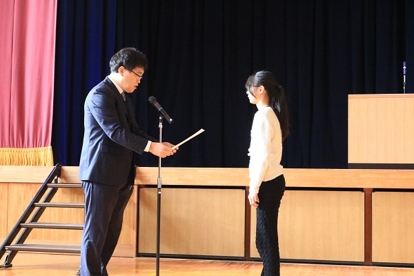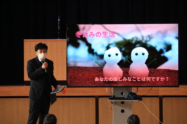 校長式辞では、2学期の行事や取組、日常の様子を思い出しつつ、自分にとってどのような2学期だったのかを振り返る時間も取りました。マラソン選手であった君原健二さんの話を交えつつ、自分なりの目標を持つことや、毎日小さな目標を決め、それをスモールステップでクリアしてゴールに近づいていくという話をしました。このことが子どもたちの意識の中に残り、実際にやってみる子どもが一人でも多くいたらいいなと思います。