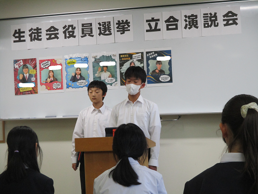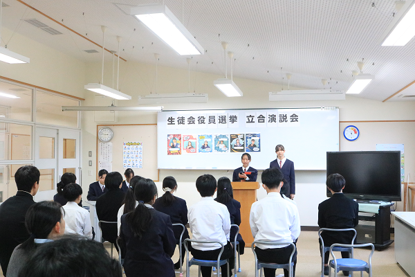 立候補者の応援演説、そして立候補者による演説が順次行われました。上林中学校を「こんな学校にしたい!」とか「自分は役員としてこういう働きがしたい!」と一人一人が熱く語っていました。聞いていて本当に心強く、頼もしいなと感じました。