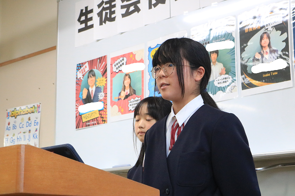 12月11日(木)に令和8年度の生徒会役員を決めるための立ち会い演説会と選挙を行いました。それぞれの役職に対して計6名の立候補者がありました。選挙広報やポスターも作成し、一人一人が上林中学校への思いを込めて、立ち会い演説会に臨みました。