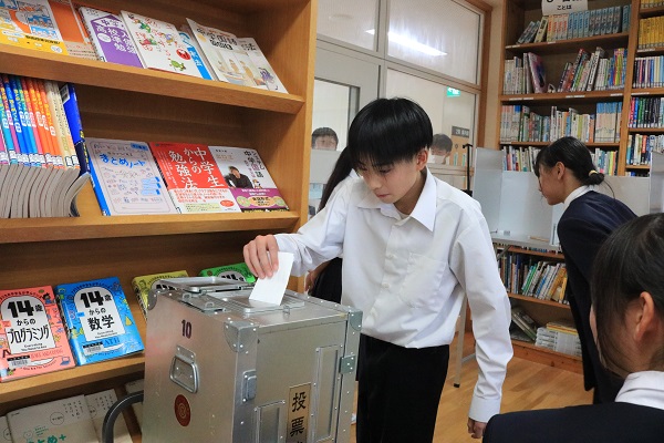 立ち会い演説会終了後、役員選挙で一人一人が投票をおこないました。担当教員が市の選挙管理委員会から投票記載台や投票箱を借りてきて、実際の選挙に限りなく近づける形で実施しました。生徒たちも緊張の面持ちで投票を行いました。