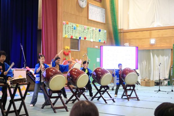 オープニングは低中校別の力強い太鼓の演奏。そしてそれぞれ工夫を凝らした発表が行われました。正面で見ていた6年生も思わず笑顔になるような、思いのこもった発表ばかりでした。