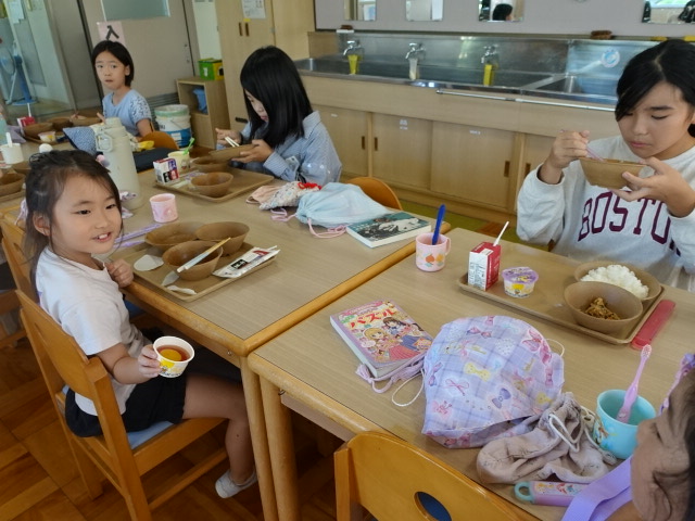今日からランチルームでの給食を再開しました。今日は一年生と四年生。久しぶりなので、準備の手順を少し忘れていましたが無事交流をしながら食べることができました。今日のメニューは秋のちらし寿司とサツマイモの味噌汁、そしてお月見ゼリー。「見て!かわいい。」とウサギの月のゼリーに嬉しそうでした。
