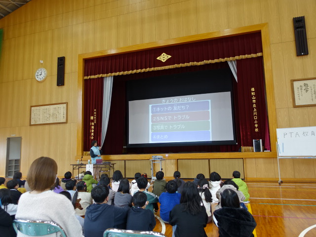 今日は人権学習の参観日でした。1年生は「みんな大好き1年生」の教材でクラスの友だちのいいところを見つける学習で、「苦手なことがあってもみんないいところがある」ということを学んでいました。各学年それぞれの教材で真剣に学習に向かっていました。また、PTAの人権講演会として京都府警のネット安心アドバイザーの方に来ていただきネットトラブルに巻き込まれないために注意をすることを学びました。