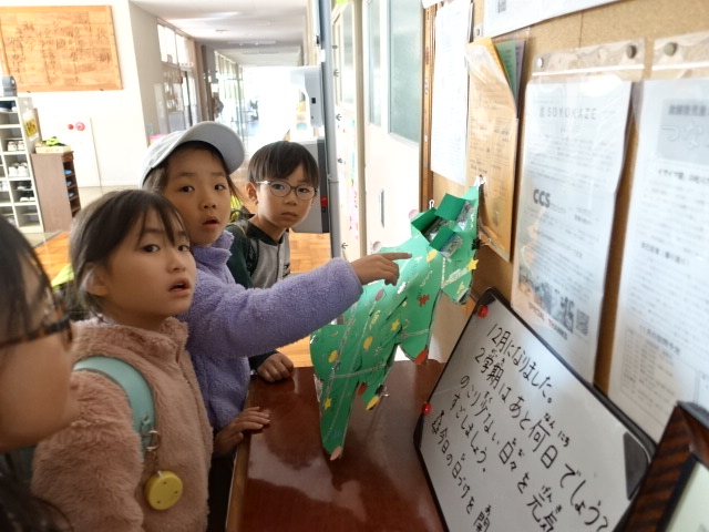 今年もあとわずか。学校に登校する日数も10日余りとなりました。校長室の前にツリーのアドベントカレンダーを置きました。日にちの窓を開けると先生達が書いたイラストが出てきます。「今日は○○先生や。」「明日私が1番に開けたい。」などと毎日楽しみにしているようです。