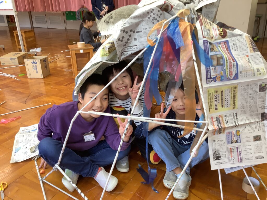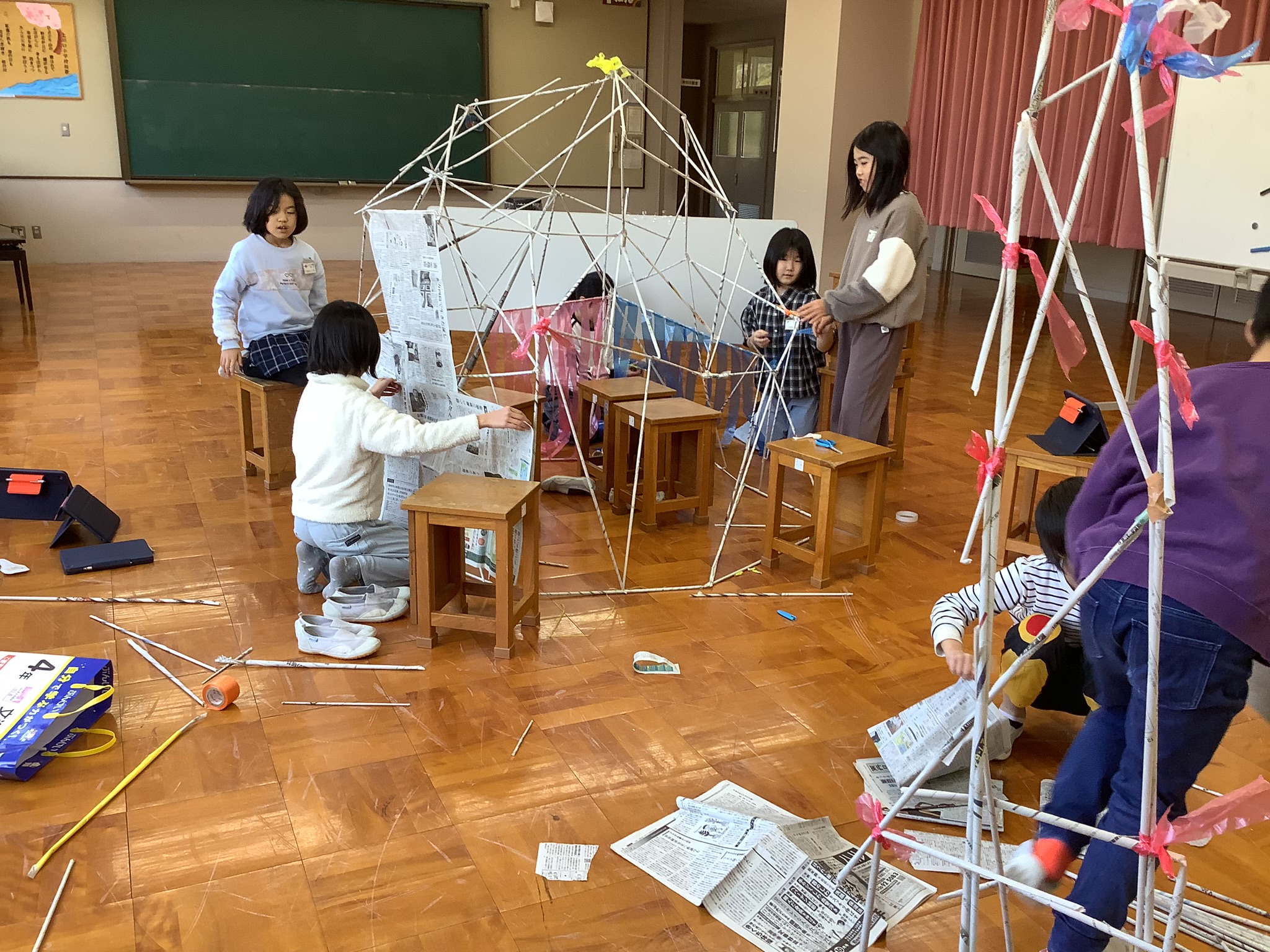4年生が図画工作で、新聞紙を使っての創作活動をしていました。細く丸めて棒にした物を組みテント風に組み立てる等、子どもたちの発想をグループで協力しながらどんどん形にしていました。中に入れるほどの大きな創作物ができ、とても満足そうでした。将来、建築家が生まれるかも・・・