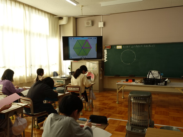 5年生は算数で図形の学習をしています。今日はコンパスを使って六角形を書く学習でした。少しの誤差で正しい形にずれが出てしまうので不慣れなコンパスを使って一生懸命がんばっていました。