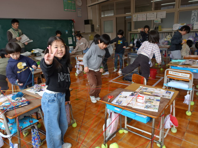 3年生 ひもでつないで 最近の上川口小 Twitter Facebook はてブ Pocket LINE コピー 2026.01.15 3年生が図工の学習で、教室中をいろいろな毛糸でつないでいました。いたるところが毛糸だらけで、くぐったり飛び越えたりしながら移動しないといけません。毛糸で教室がこんなに面白い空間になることをみんなで楽しんでいました。