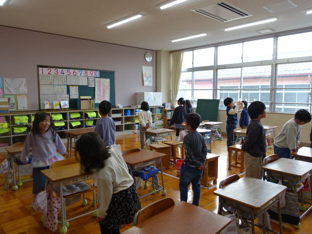 全校合唱「世界が1つになるまで」がだんだん歌えるようになってきました。1年教室に入ると前を向いている子と後ろを向いている子? 聞くと歌詞を覚えられた子は歌詞を見ずに後ろを向いて歌っているそうです。出発を祝う会には全校でよい合唱ができそうです。