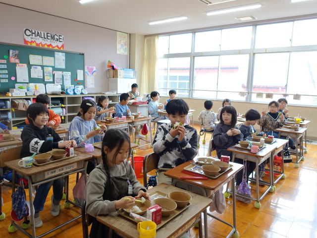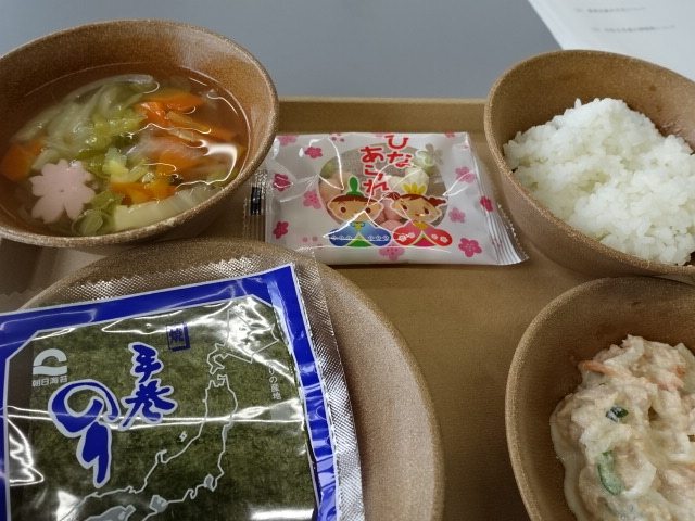 ひな祭りにちなんで、今日の献立は手巻き寿司とひなあられでした。お汁には桜のかたちのかまぼこも入っていてなんだか嬉しくなります。手巻きの具はツナマヨで、「具だけ余った。」「のりがなくなった~。」と分量の調整は難しそうでしたがそれぞれ工夫をして「おいしい!」と食べていました。