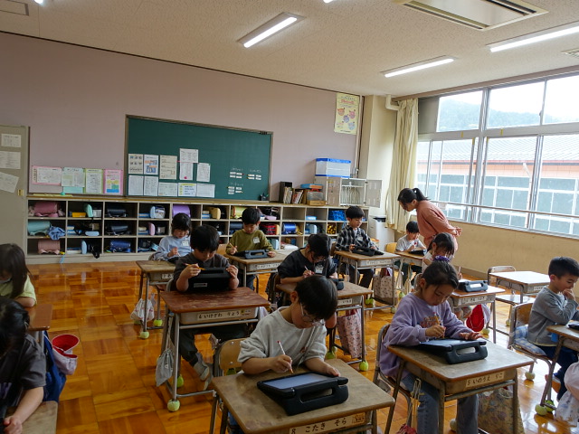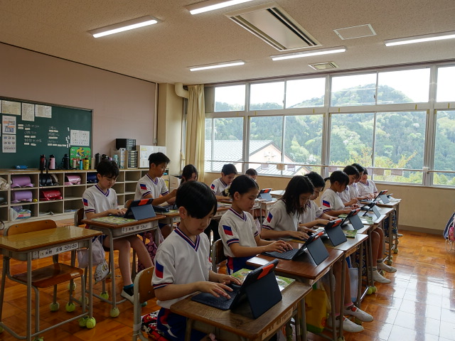 今日から毎週金曜日の昼休み後、まるぐタイムが始まりました。タブレットのアプリを使って学習をする時間です。漢字や計算、タイピングの練習とさまざまな内容で全学年タブレットに向かっていました。1年生も登録を終えいよいよタブレット学習を始めます。そしてさすが高学年、シーンとした教室にタイピングの音だけが響いていました。