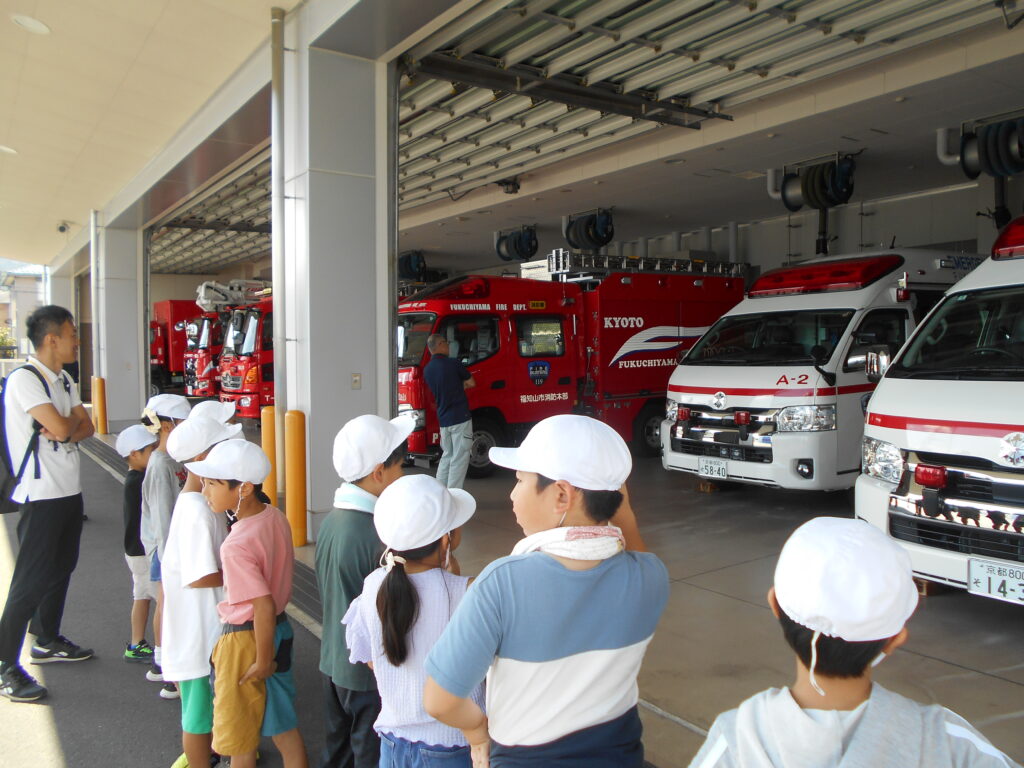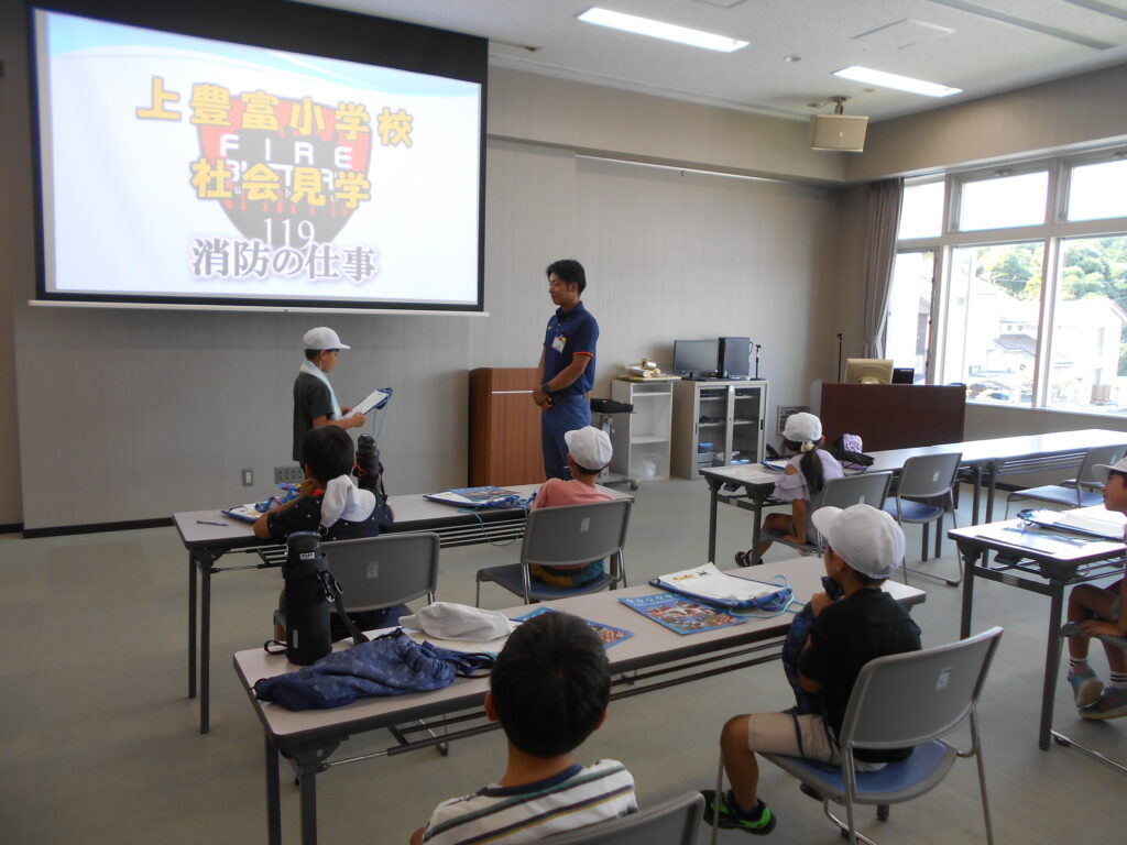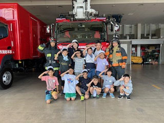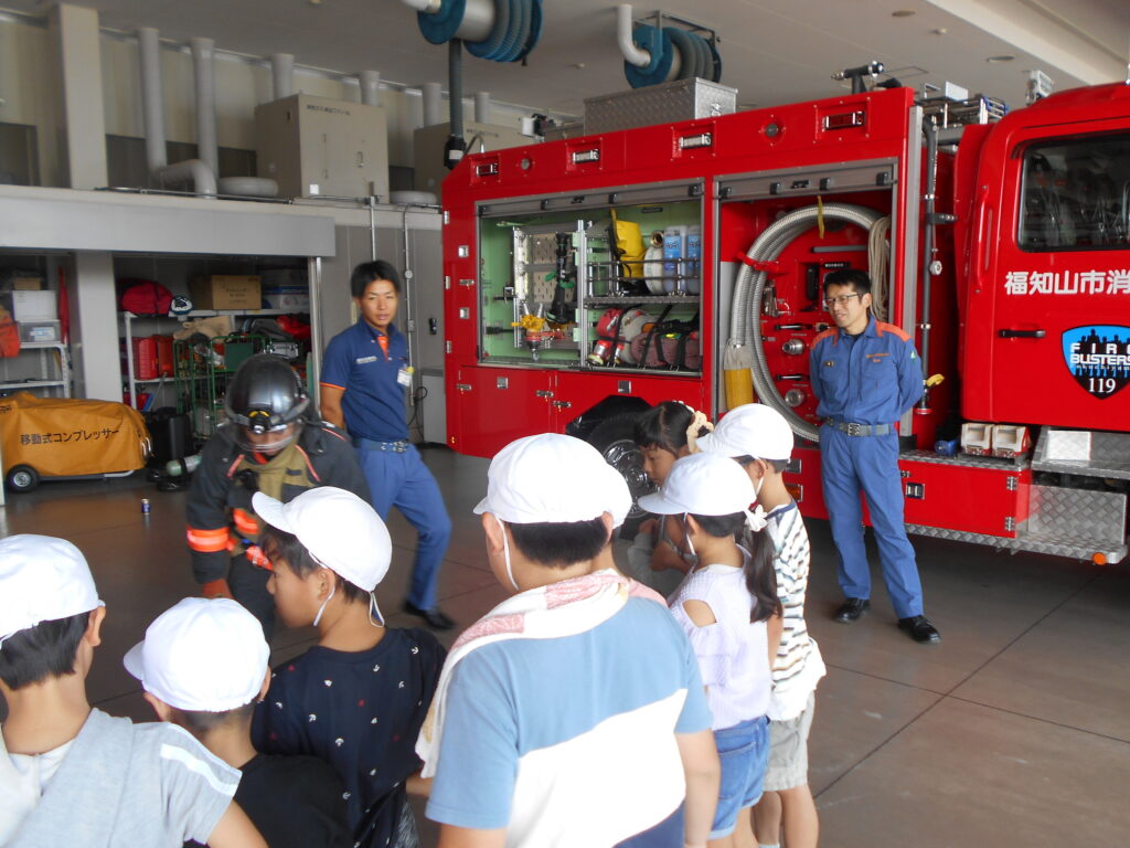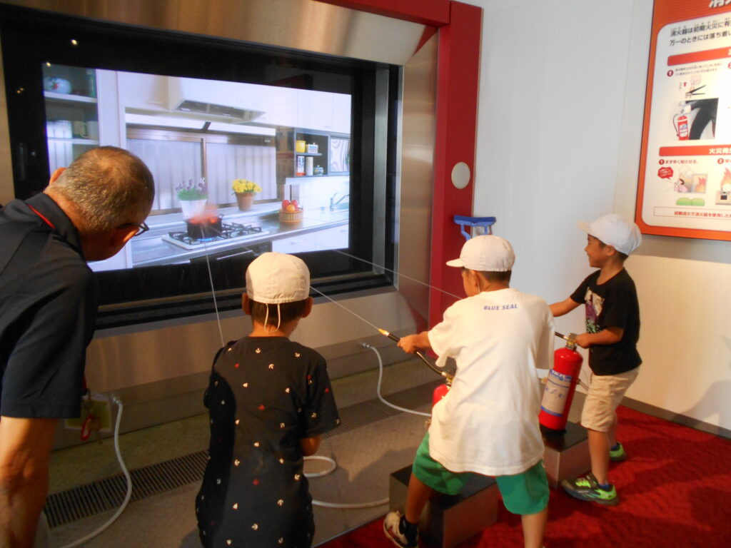 まず、写真・グラフ・表などを見せていただきながら消防署の仕事についてとても分かりやすく教えていただきました。その後、煙体験、放水体験をしました。煙のなかでは体を低くして煙を吸わないようにすることや、火は根元をめがけて放水することなどを学びました。