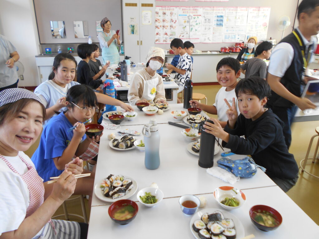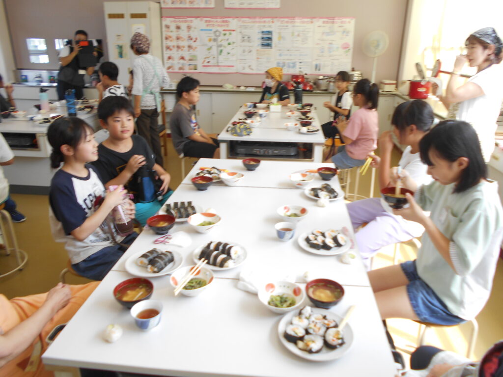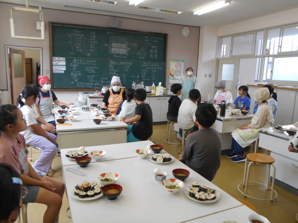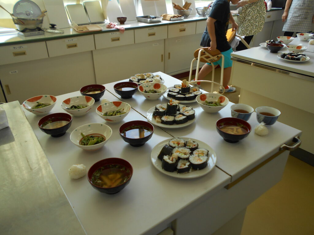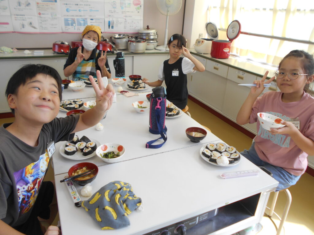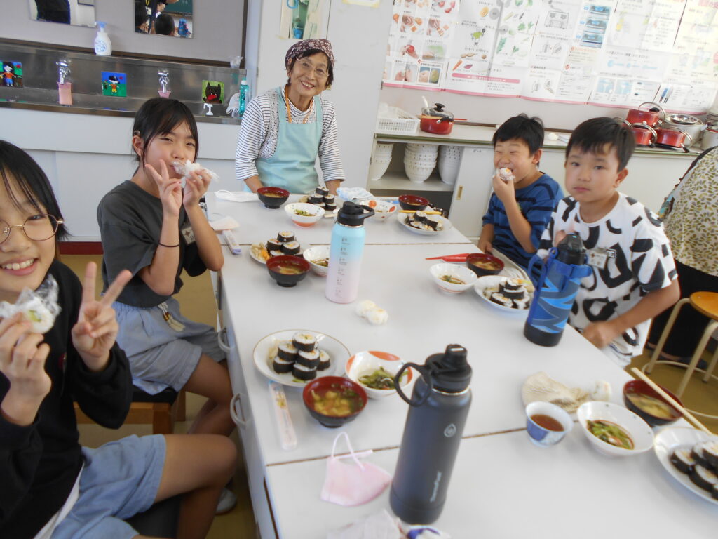 5年生は一人1本ずつ巻き寿司をつくりました。簀巻きで上手に巻くことができおいしくいただきました。すまし汁、おひたしを添えて一汁一菜の献立でした。
