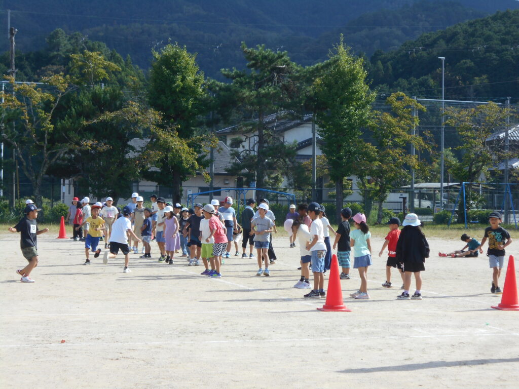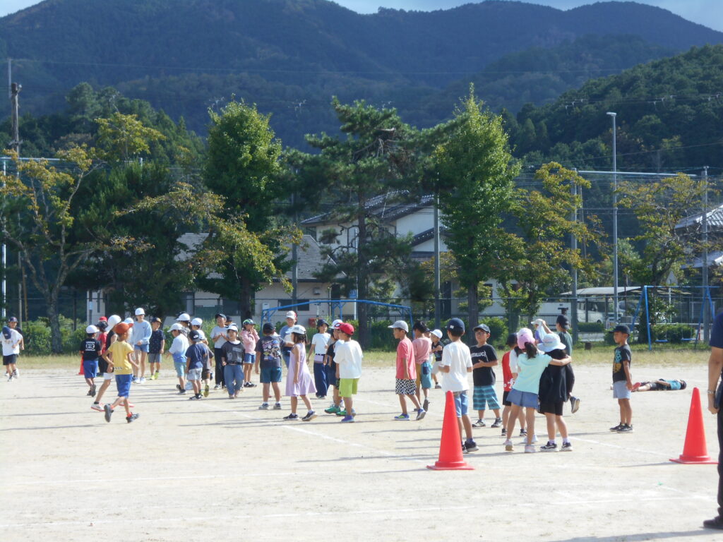 ランラビットランに似た鬼ごっこでした。でもつかまえるのが「サメ」の設定だったので4年生に捕まった1~3年生はとっても怖がっていました。