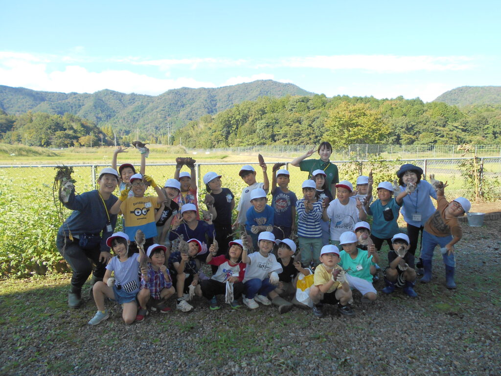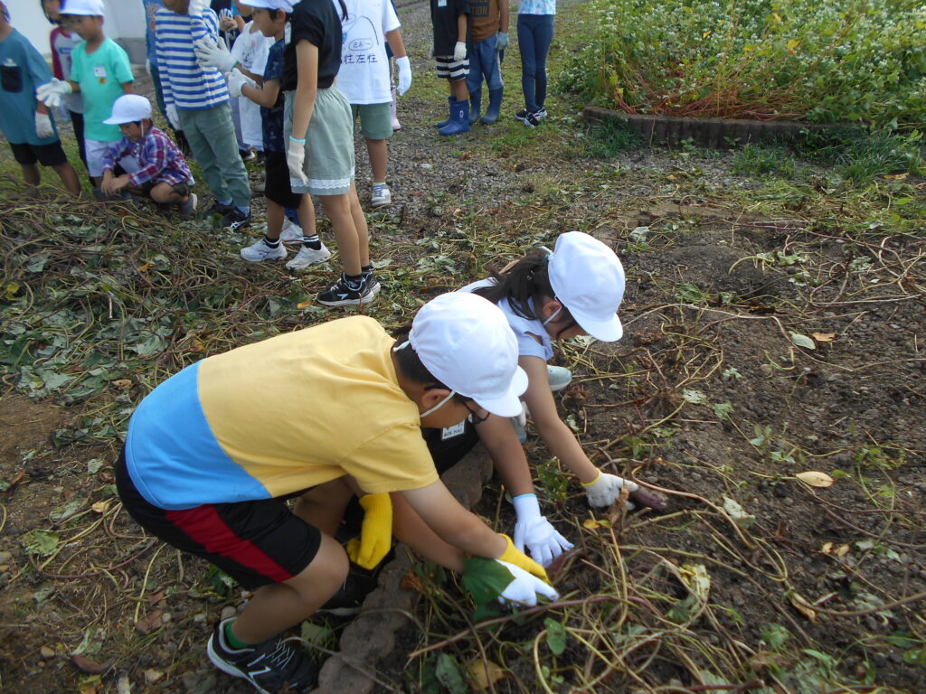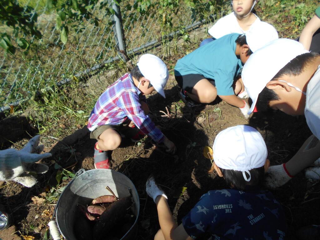 今年植えたさつまいもはぐんぐん成長し、つるもあおあおとしげりました。つるをどけて掘っていくと、バケツ3杯分以上のさつまいもが収穫できました。「大学芋にしたい!」と2年生。どんなおいも料理をつくって食べるか楽しみです。