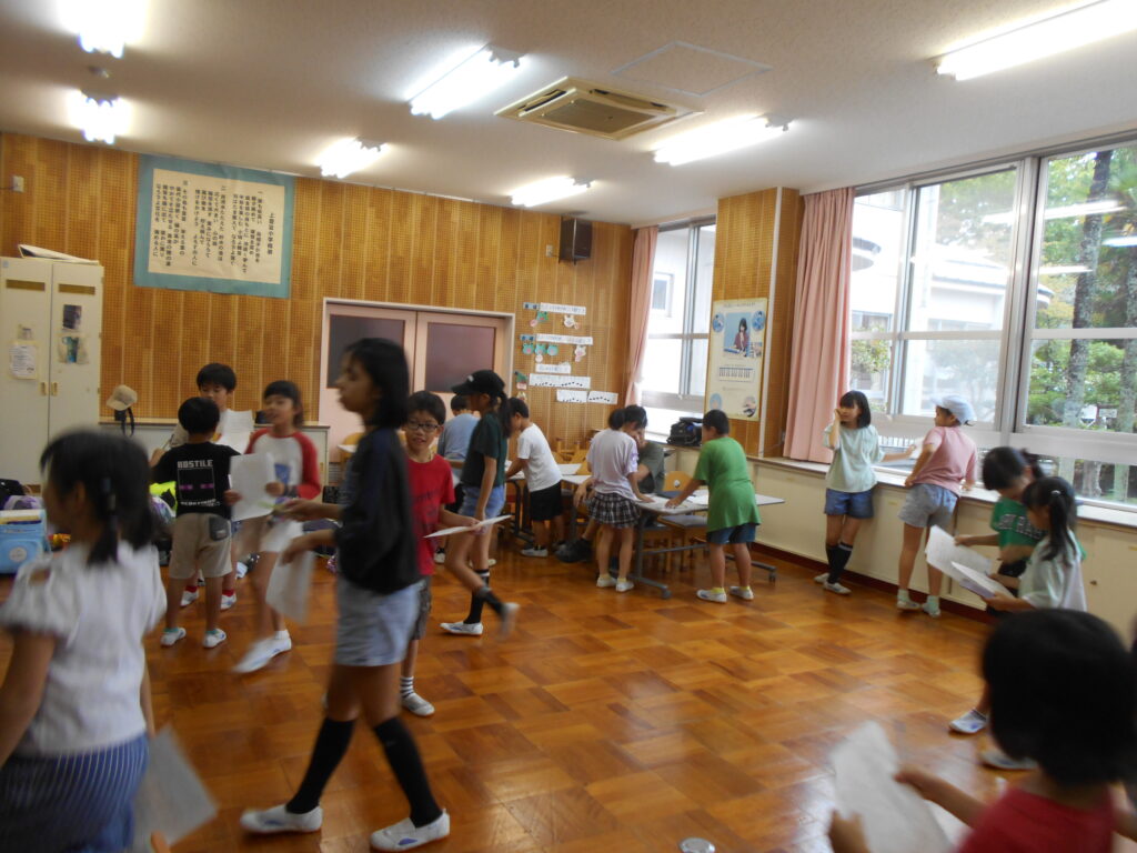 今年、2度目の取組になります。雨のため、外遊びができなくなってしまいました。でも、雨バージョンをちゃんと計画してくれていました。探偵ゲーム2回目を赤組、青組、黄組に分かれて室内で行いました。前回とは違うお題、色によっても違うお題でした。前回よりたくさんのサインを集められました。