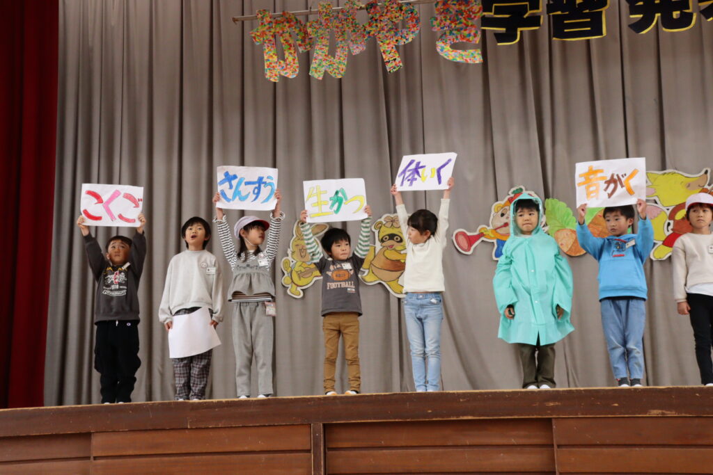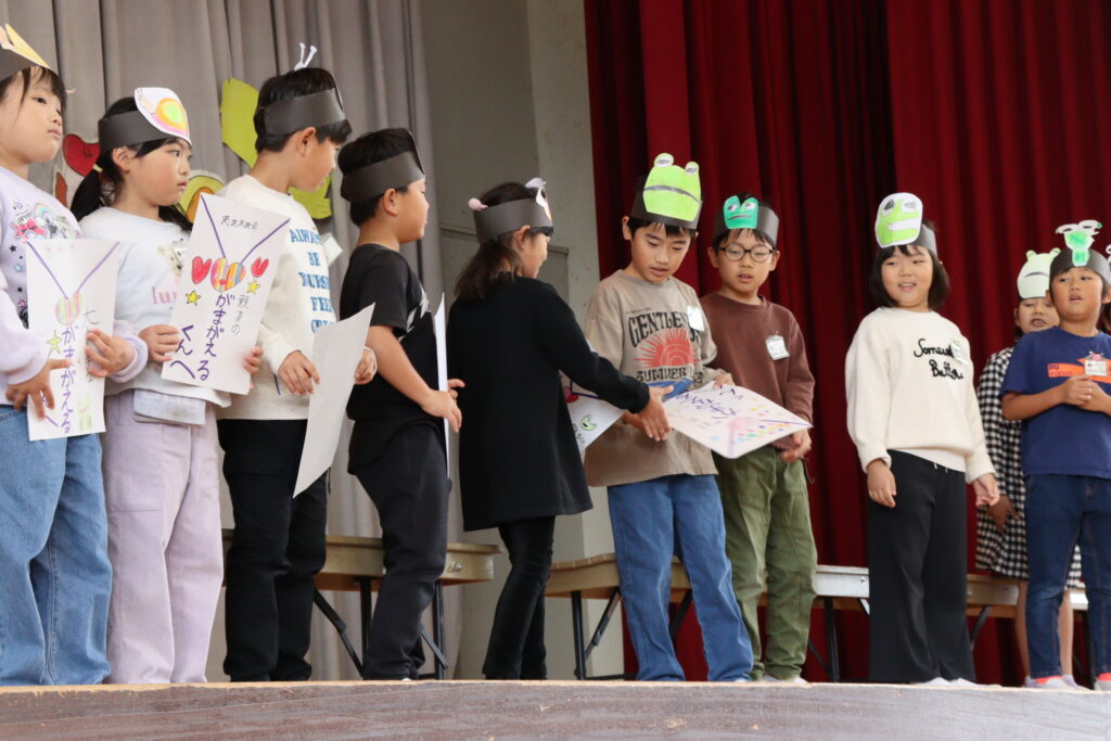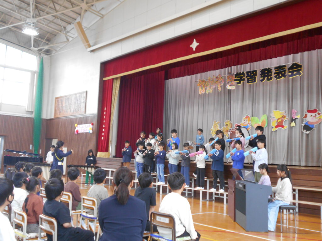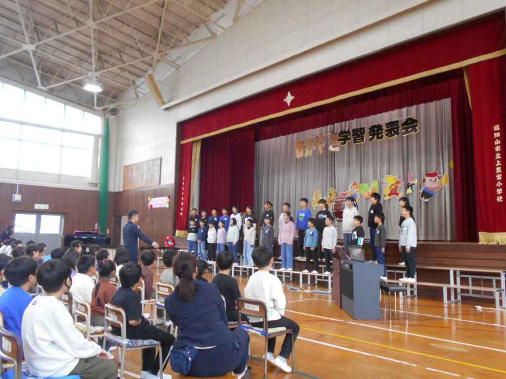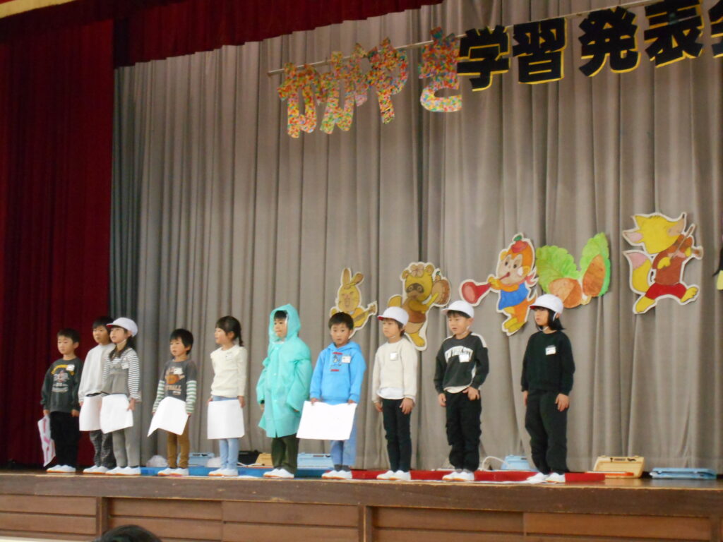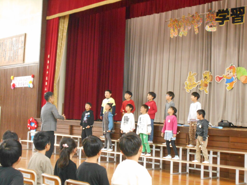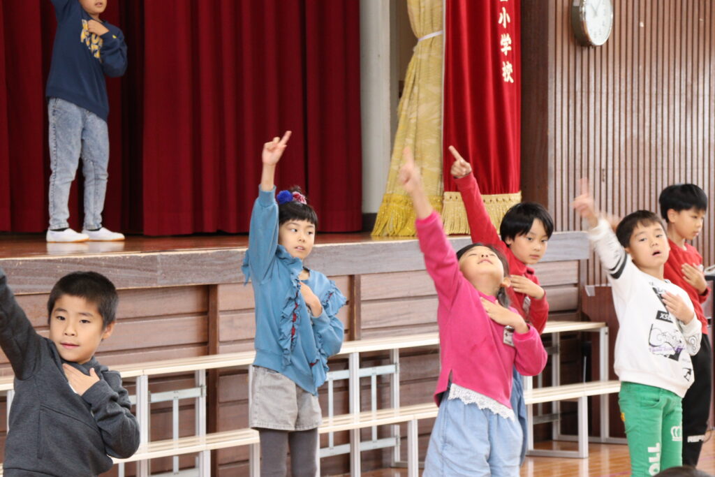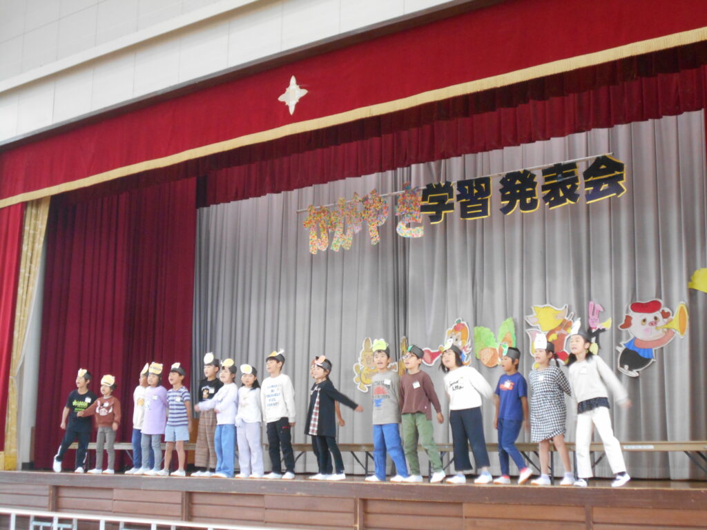 今日はかがやき学習発表会を開催しました。約80名の保護者や地域のみなさまに参観いだきありがとうございました。1年生は初めての学習発表会でしたが、大きな声、大きな動作でしっかり発表ができました。今年は、1・2年、3・4年、5・6年で表現運動ダンスを披露しました。振り付けは、自分たちで考えるパートを作って、それぞれグループで考えて振り付けをし、ダンスを創り上げました。学年発表は、できるようになったことの発表、歌や、リコーダー奏、合奏、音読劇、合唱などなど日頃の学習でがんばってきたことを発表しました。準備、片付けは5・6年生が分担して行い、当日の司会進行もプロデュース委員会+4年生が行いました。子ども達のかがやきが素晴らしかったです。