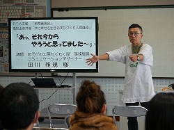 今年度の教育講演会は、あそびの工房もくもく屋の事務局長であり、コミュニケーションデザイナーの田川雅規様に、『あっ、それ今からやろうと思ってました~』という演題でお話をしていただきました。ついつい先回りして、子どもが考える時間やできることを増やす機会を奪っていませんか?との問いかけに、日頃の子育てや指導のことを振り返ったり、これからの子どもとの接し方を考えたりする機会となりました。近くの人と話し合う時間を何度もとってくださるなど、楽しい雰囲気の中で、これからの子育てに勇気を与えてくださる講演でした。