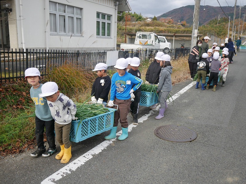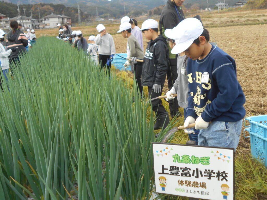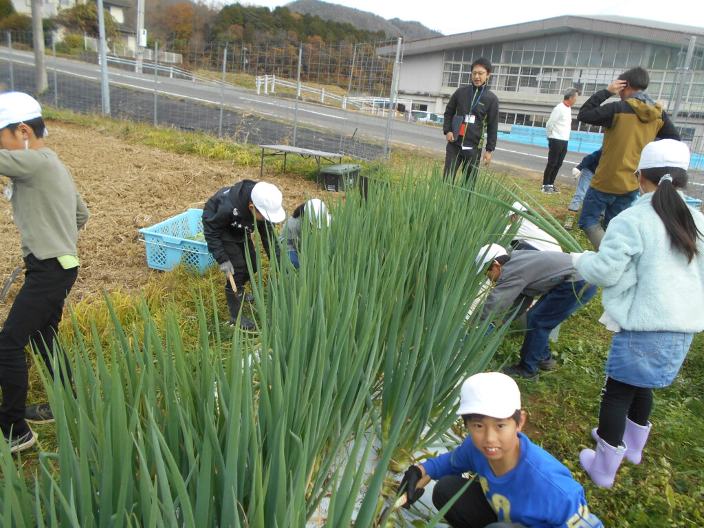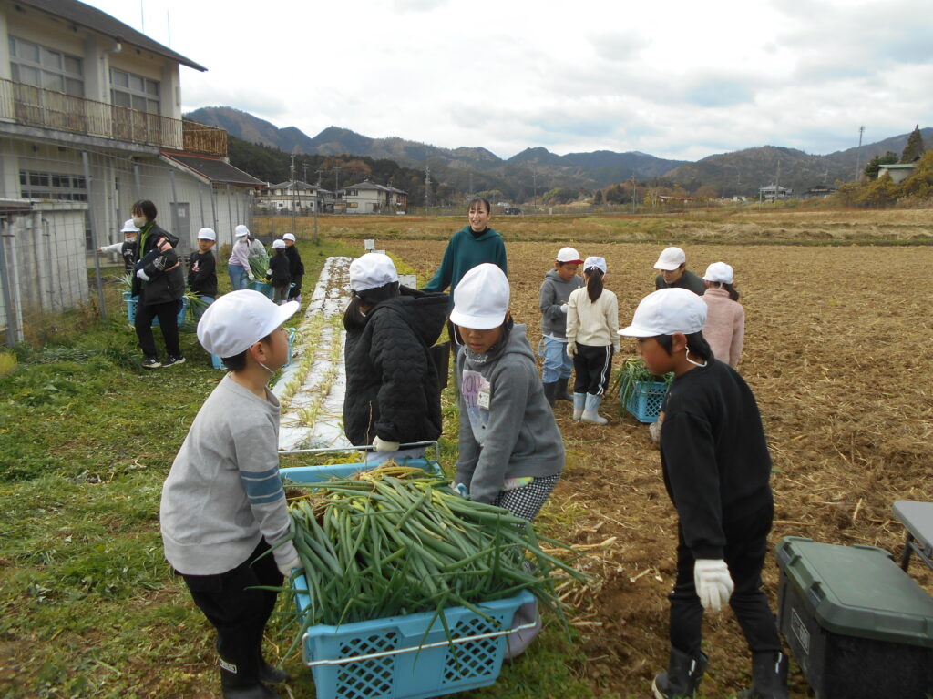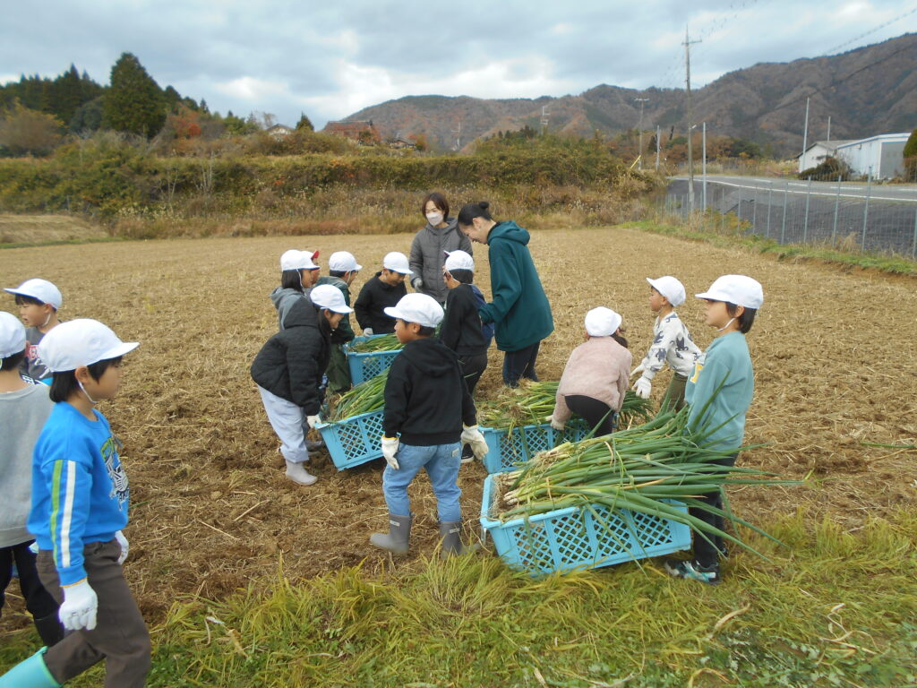 7月14日に地域の方からお話をいただき、九条ネギの植え付け体験をしました。1・2年生が生活科の学習で、4年生が社会科の学習で体験しています。この日は、大きく育った九条ネギの収穫体験をしました。大きいものでは1mくらいに成長していました。1・2年生は株ごと、4年生は鎌を使っての刈り取りで収穫をしました。みんな大きく育ったネギを楽しんで収穫しました。ネギの植え付け、圃場の管理、収穫体験をお世話になった皆様、ありがとうございました。子ども達が持ち帰ったネギはご家庭でおいしくめしあがってください。