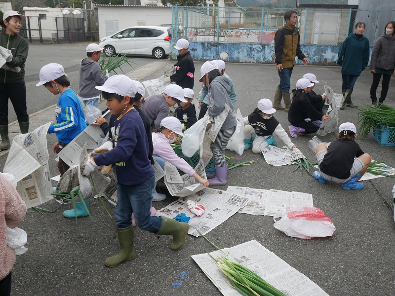 30分もしないうちに全て収穫しコンテナに入れて学校まで運びました。その後、持ち帰れるよう新聞に包む作業もがんばりました。
