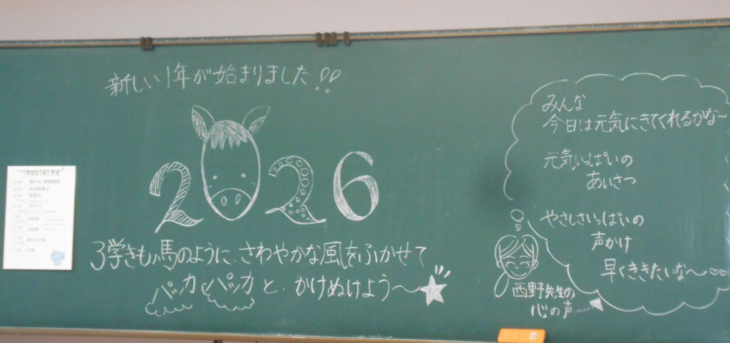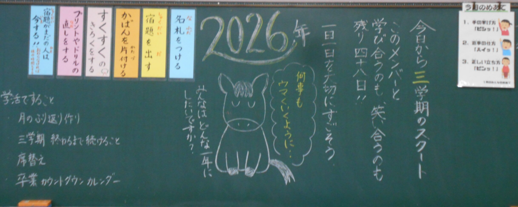 今日から3学期がスタートしました。学校朝礼では、今年の干支にちなんで目標に向かって、エネルギッシュに走る1年にしましょうとお話をしました。今日から、さっそく、登下校の見守りもお世話になっています。ありがとうございます。みんなはりきって3学期をスタートしました。今年も、どうぞよろしくお願いします。