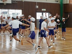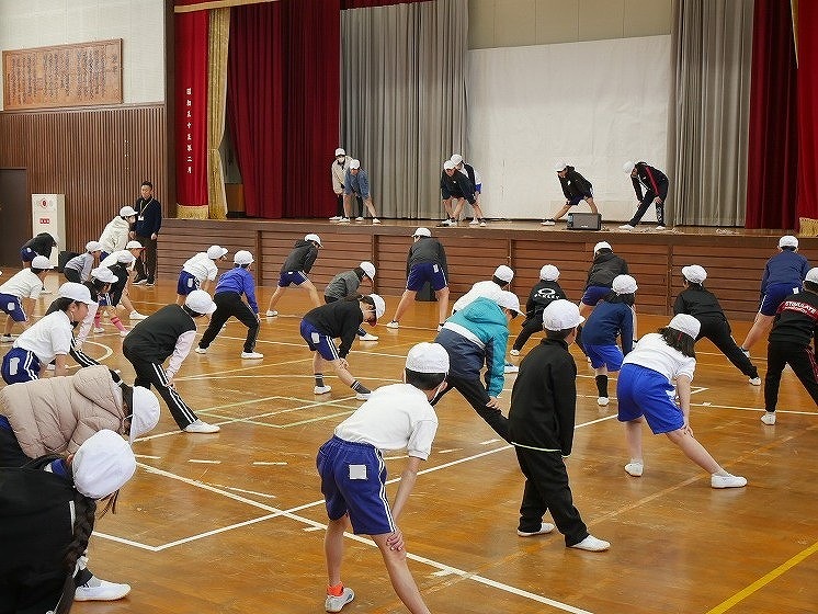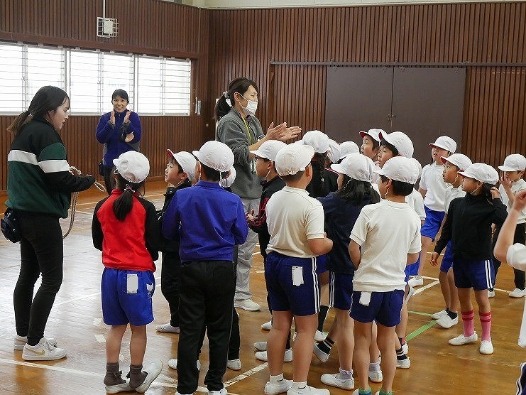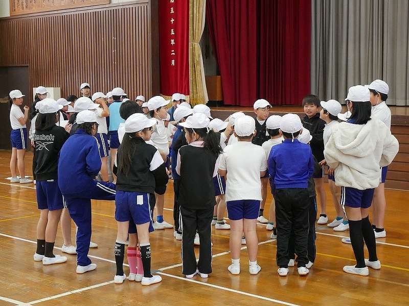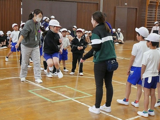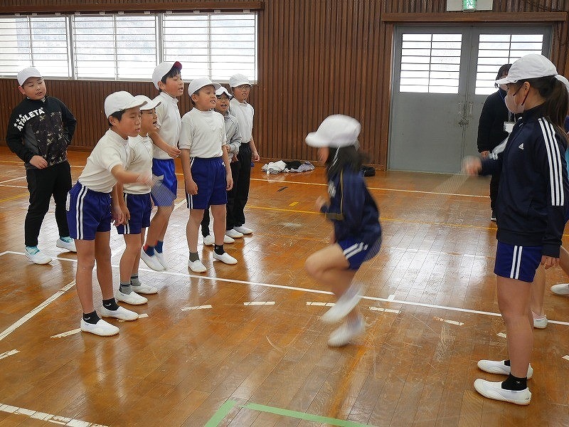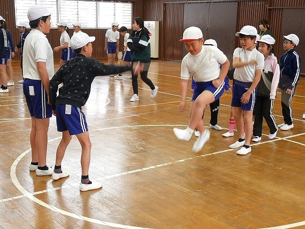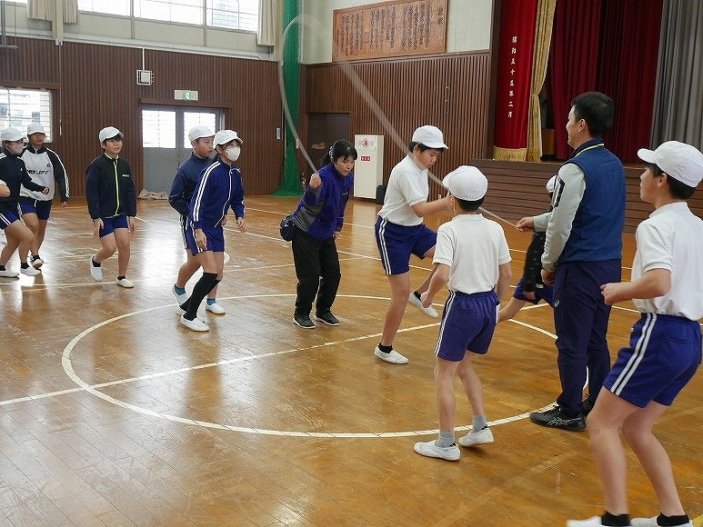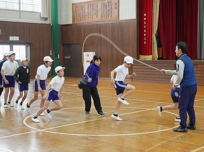 まずは、なかよし班の部からスタートです。しっかり準備運動をして、いざ計測です。みんなで回数を数えたり、友達が跳びやすいように声を掛け合ったりして、1年生から6年生までが力を合わせて記録更新に挑みました。