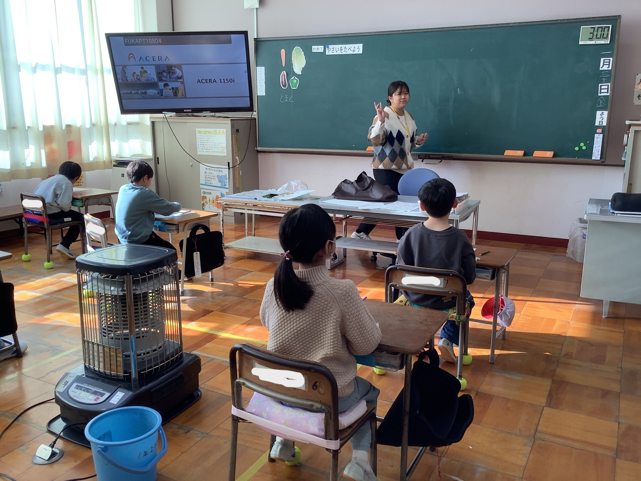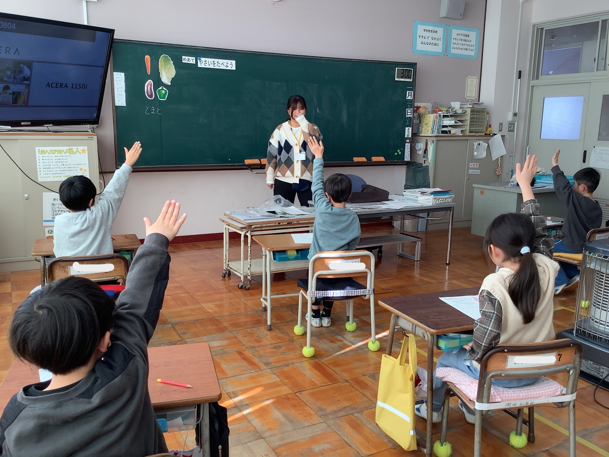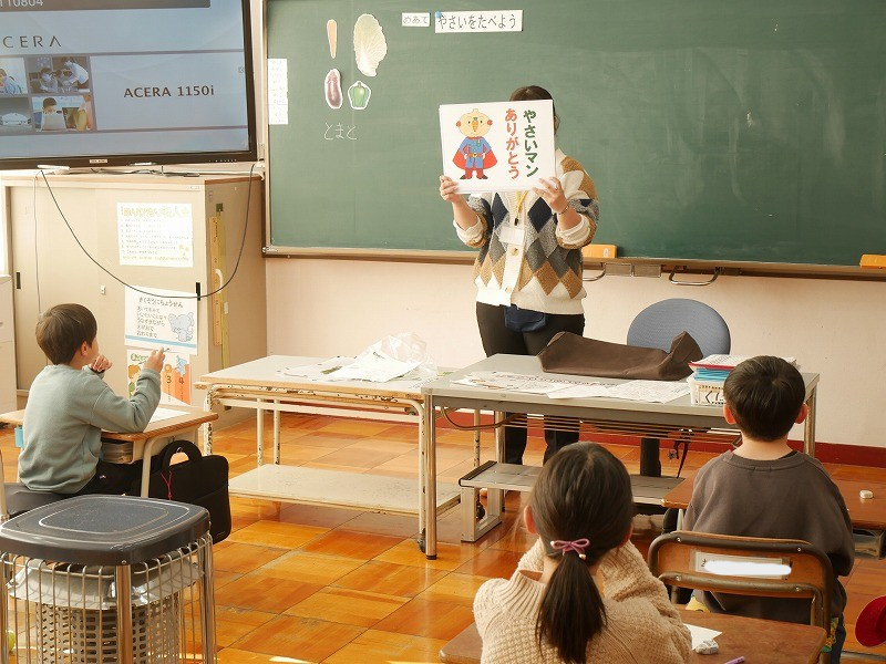 1年生は、「野菜を食べよう」というテーマで学習しました。野菜を食べるとどんないいことがあるのかみんなで考えを発表しながら考えていました。