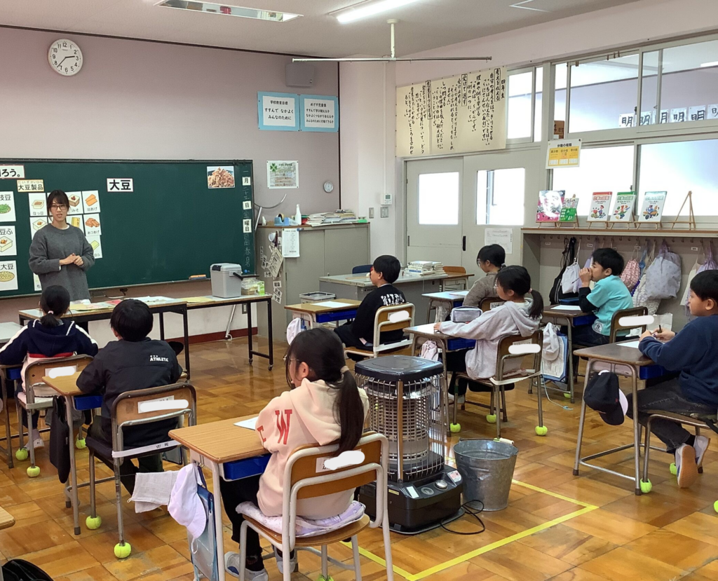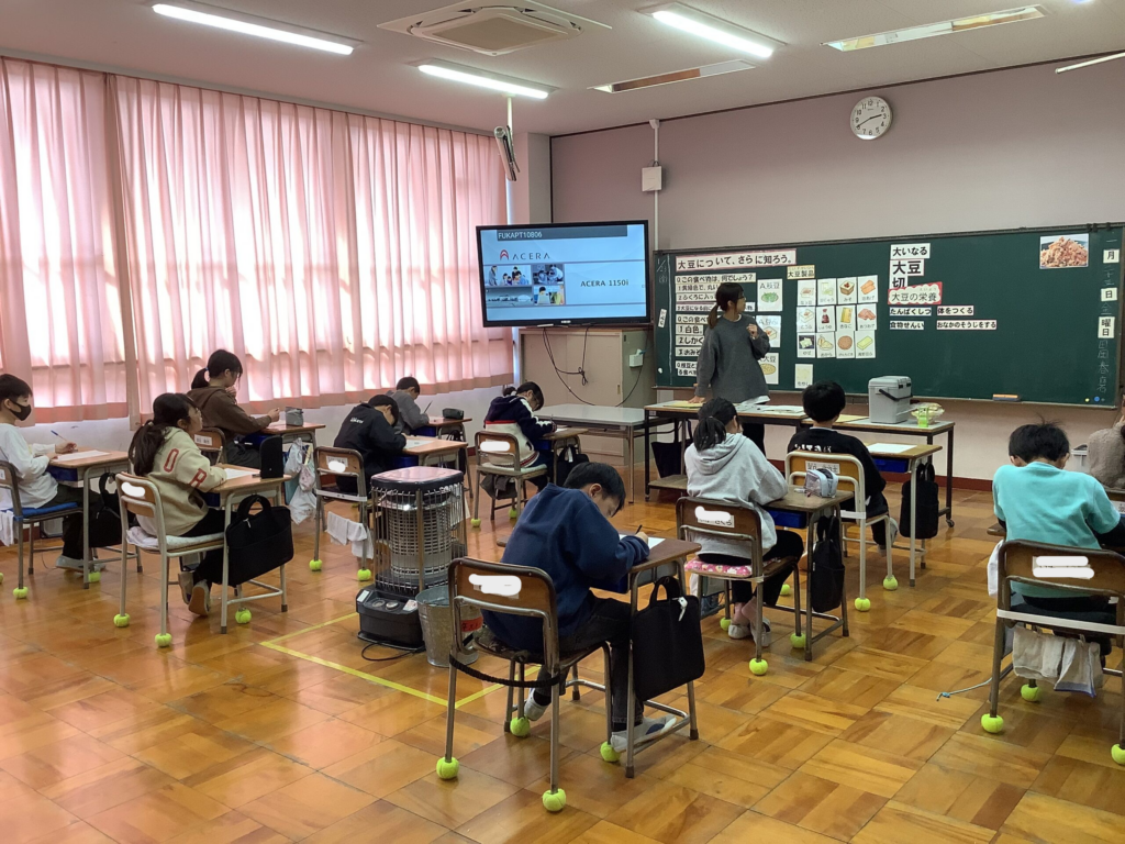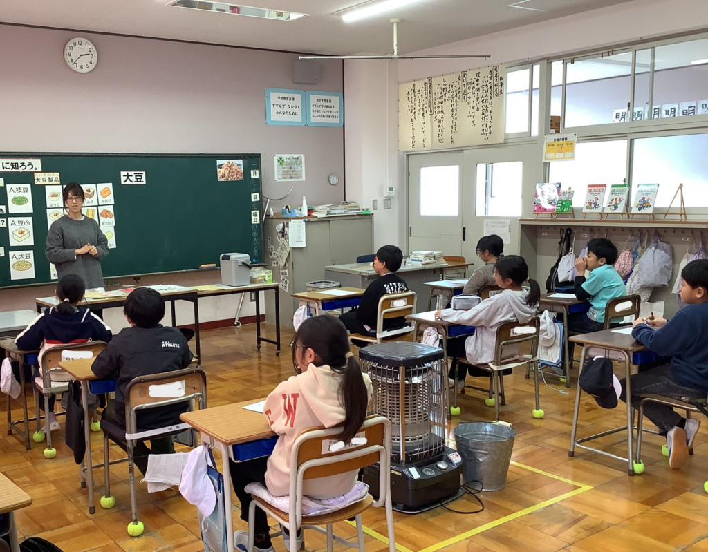 「4年生は大豆についてもっと知ろう」というテーマで学習しました。様々な食品に姿を変えて食卓にのぼっていることや、大豆の栄養素の素晴らしさについて学びました。