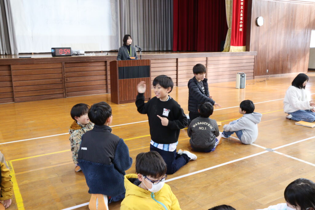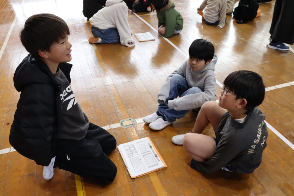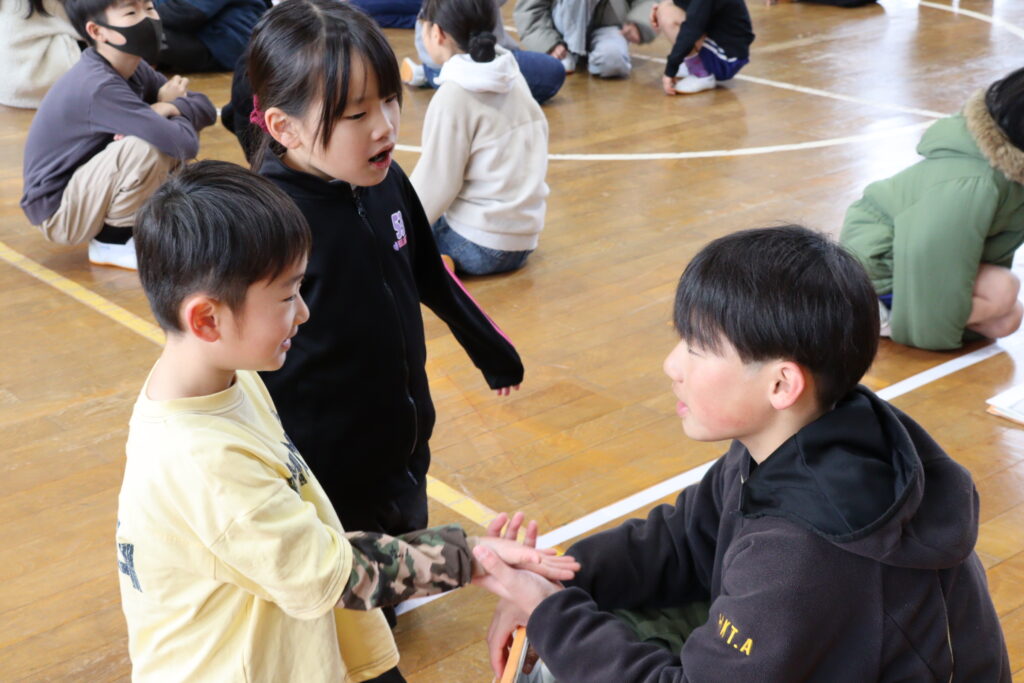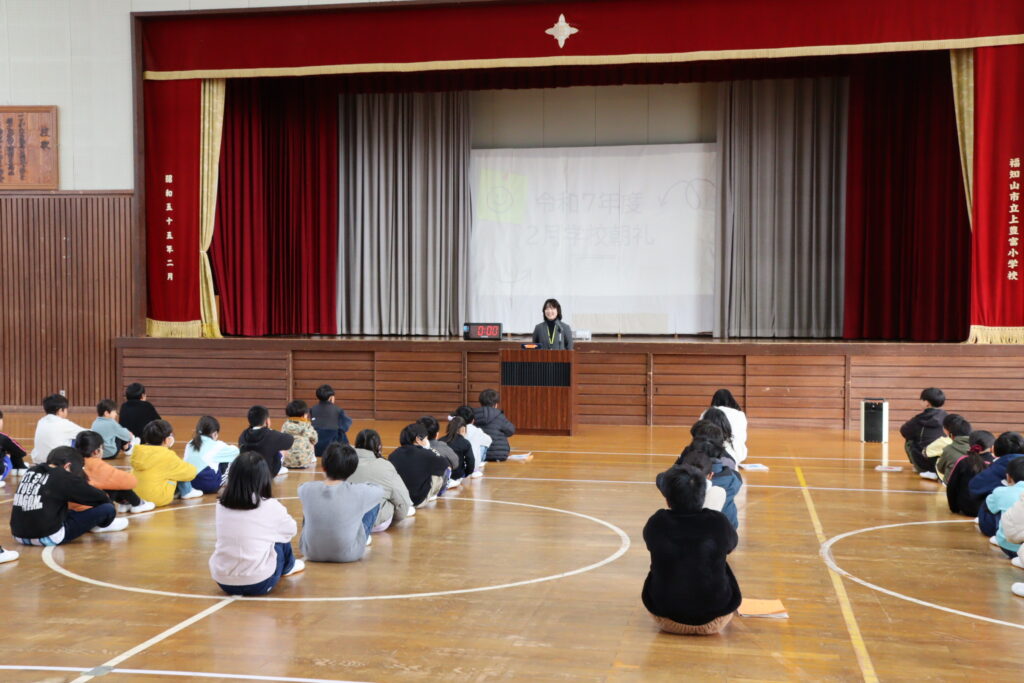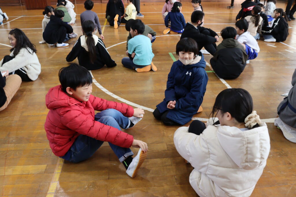 本年度の全校朝礼は、2月で最終となります。今日は、なかよし班で集合し、2~3人の小グループで対話トレーニングをしました。ルールは、「好きな食べ物」「こわいもの」「飼ってみたい動物」などテーマに沿って一人一人が話します。聞く人は、「なるほど」「そうなんだ」とうなずきながら聞きます。これを3分間続けます。このような体験の積み重ねが「安心で居心地のよい人間関係づくり」につながり、学習面では、多様な考えを自分のものにすることにつながっていきます。
