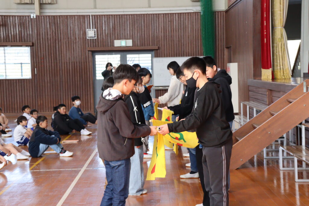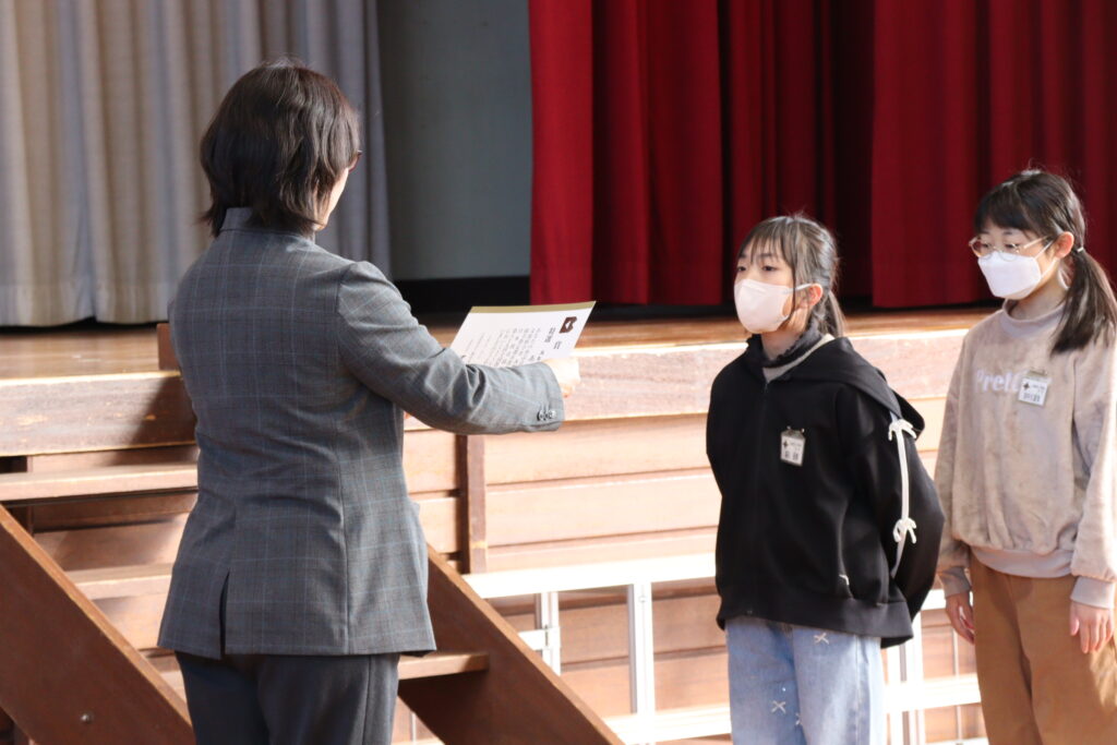 本年度最後の児童朝礼でした。はじめに絵画、読書感想文コンクールの表彰を行いその後、6年生から5年生へ、登校班旗、委員会のファイルを引き継ぐ引継式を行いました。1年間、班長として通学班のみんなの安全を守りながらがんばり、委員会活動では責任を持って当番活動を行った6年生から5年生へと班旗とファイルが引き継がれました。