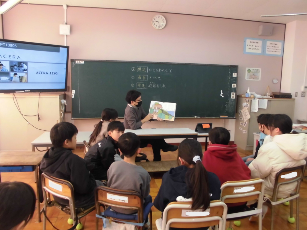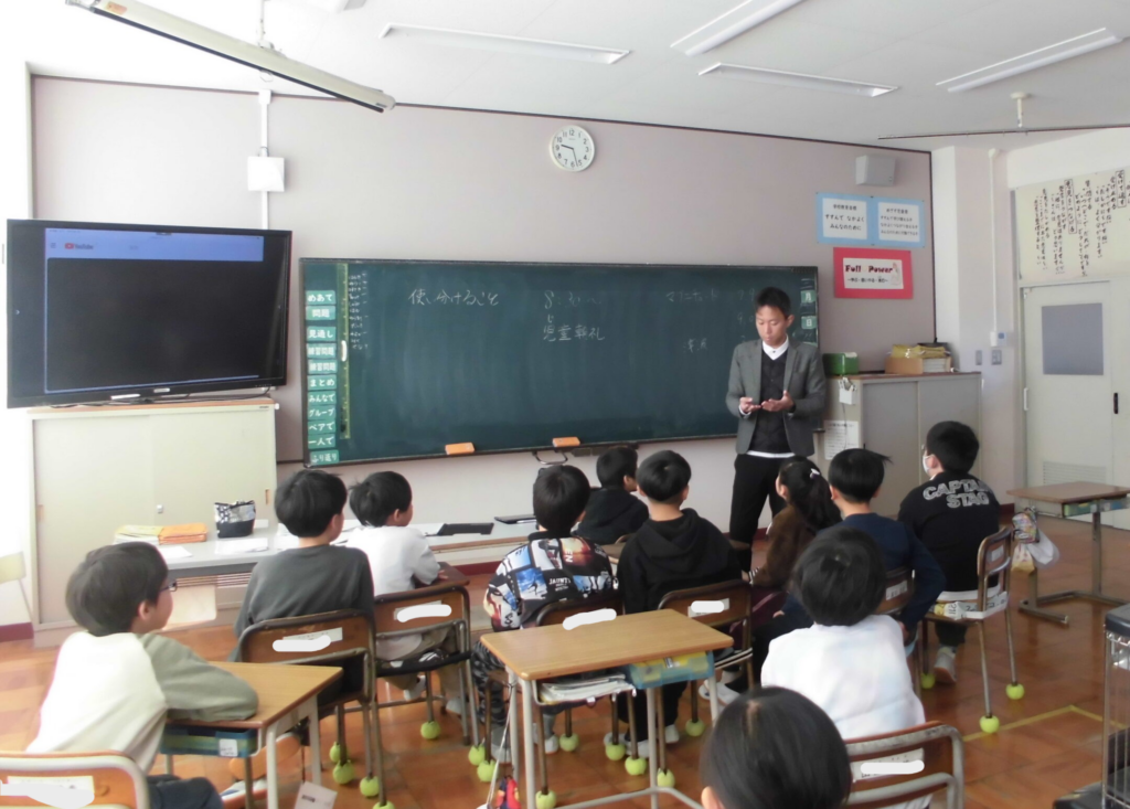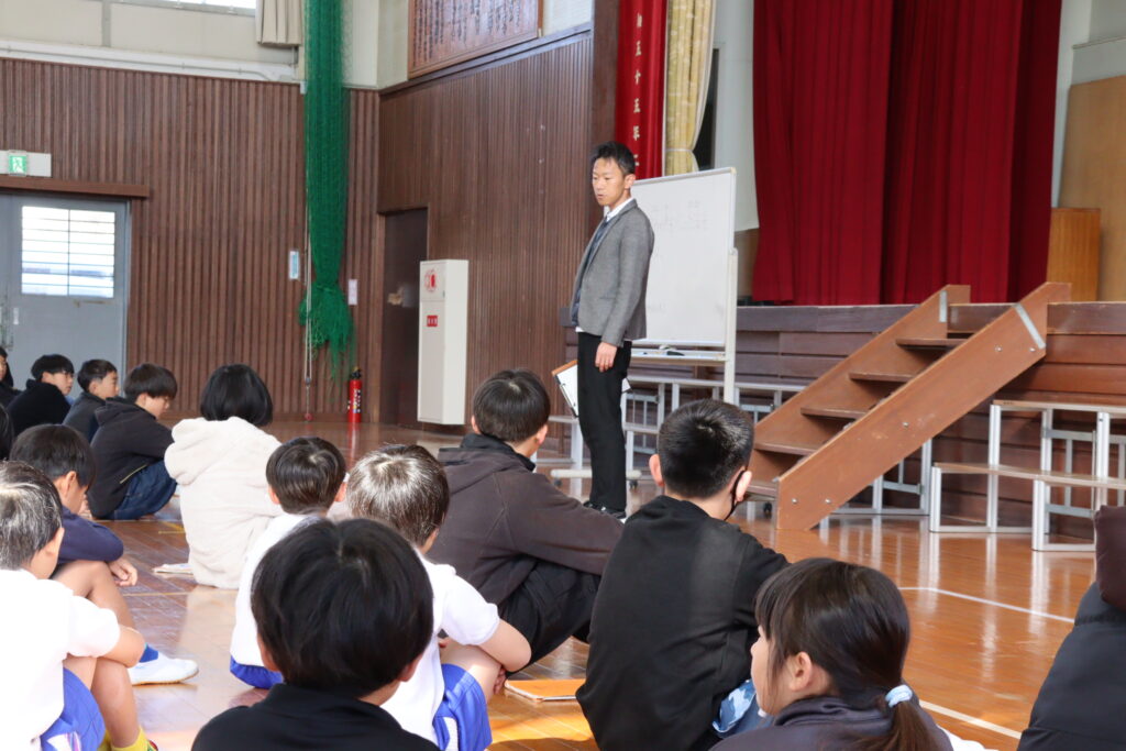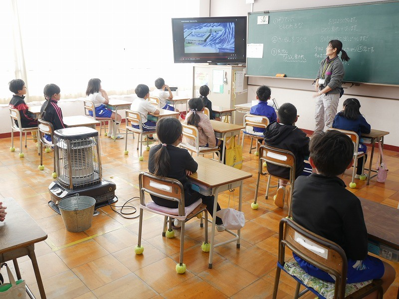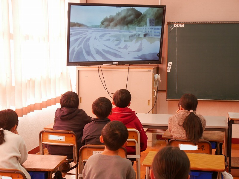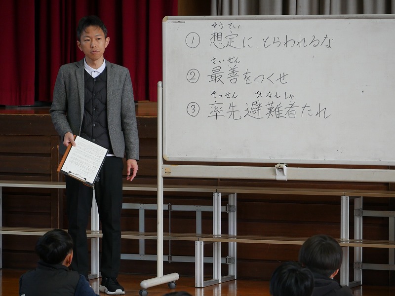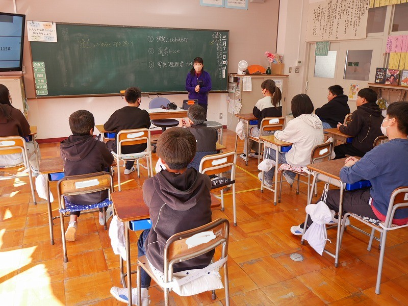 2011年3月11日。およそ2万人もの方が亡くなられた大きな地震・津波が東北地方を襲いました。この日はその教訓を忘れず、子どもたちの防災意識を高め、災害発生時どのような行動をとれば命を守れるのかについて学習しました。体育館で、2011年の被害の状況や、奇跡と呼ばれた命を守る行動をとった釜石の小中学生のお話を聞いた後、各教室でも、防災学習を行いました。