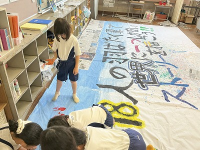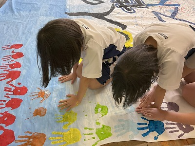 掲示するスローガンには、全校児童と教職員が一人ひとり手形を押し、みんなの気持ちをひとつにしました。小さな手から大きな手まで、たくさんの手形が重なり合い、どんなスローガンが完成するのか、いっそう楽しみが広がります。