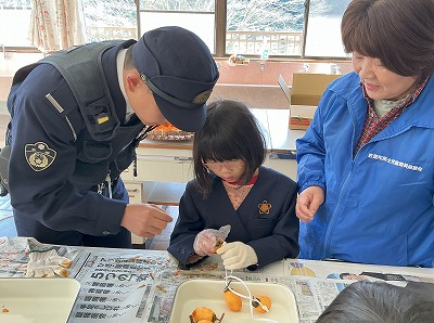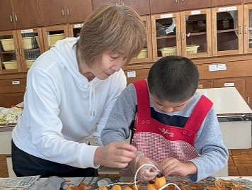 地域の方に作り方を教えていただきながら、皮むきと紐へのくくりつけをしました。