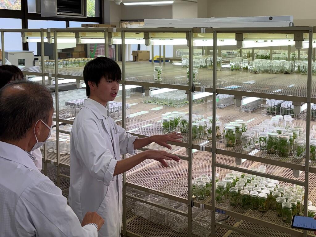 現在、花博に向けて組織培養での苗の増殖や栽培場所の様子、またMAPによる栽培試験の様子をご覧いただき、花の選定や、開花時期の確認など御助言をいただきました。