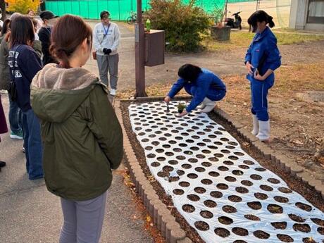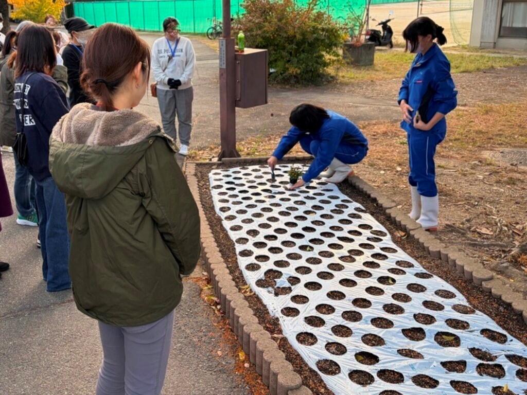 園芸ビジネス科草花専攻生徒とTAFS第3研究群の生徒も花壇のデザインを考え、イオンモールの植栽を担っておられる株式会社竹中庭園緑化様と植え付けを行う等、春花壇を彩っていました。