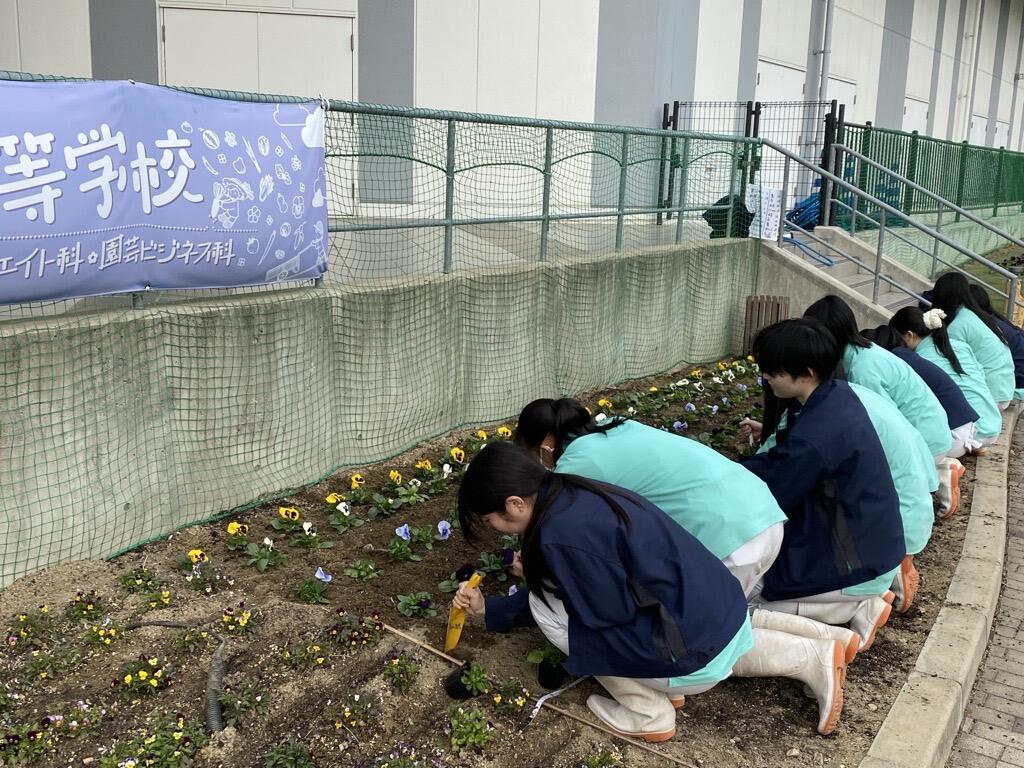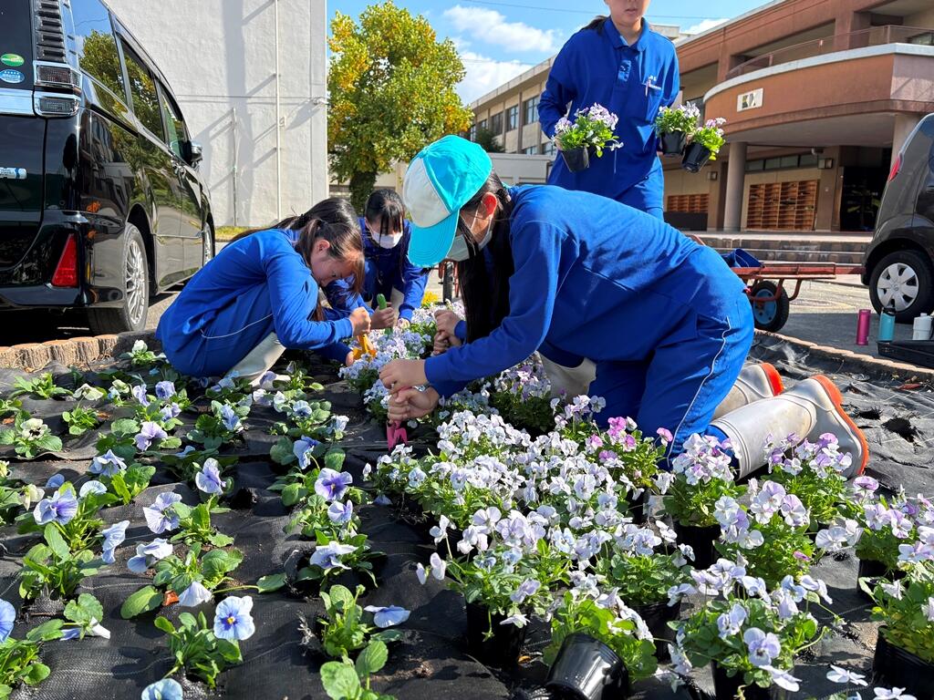 植物クリエイト科では、主に植物バイオテクノロジーを用いた草花栽培を学び、園芸ビジネス科では、施設を用いた草花生産や花壇デザイン、フラワーアレンジメントなどを学びます。それぞれ栽培する植物に特徴があり、両学科で学び栽培した植物を、学校花壇のみでなく、地域の花壇へ植栽をしています。冬から早春に向けての花壇になっていますので、本校への来校やお買い物など、各場所に足をお運びの際は、花壇も楽しんでください。