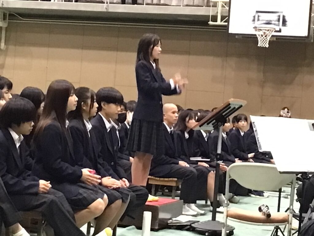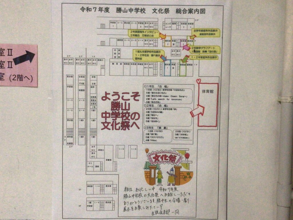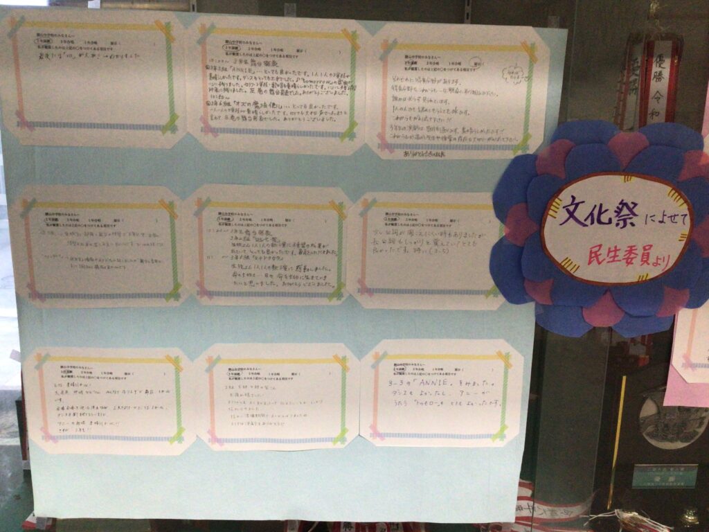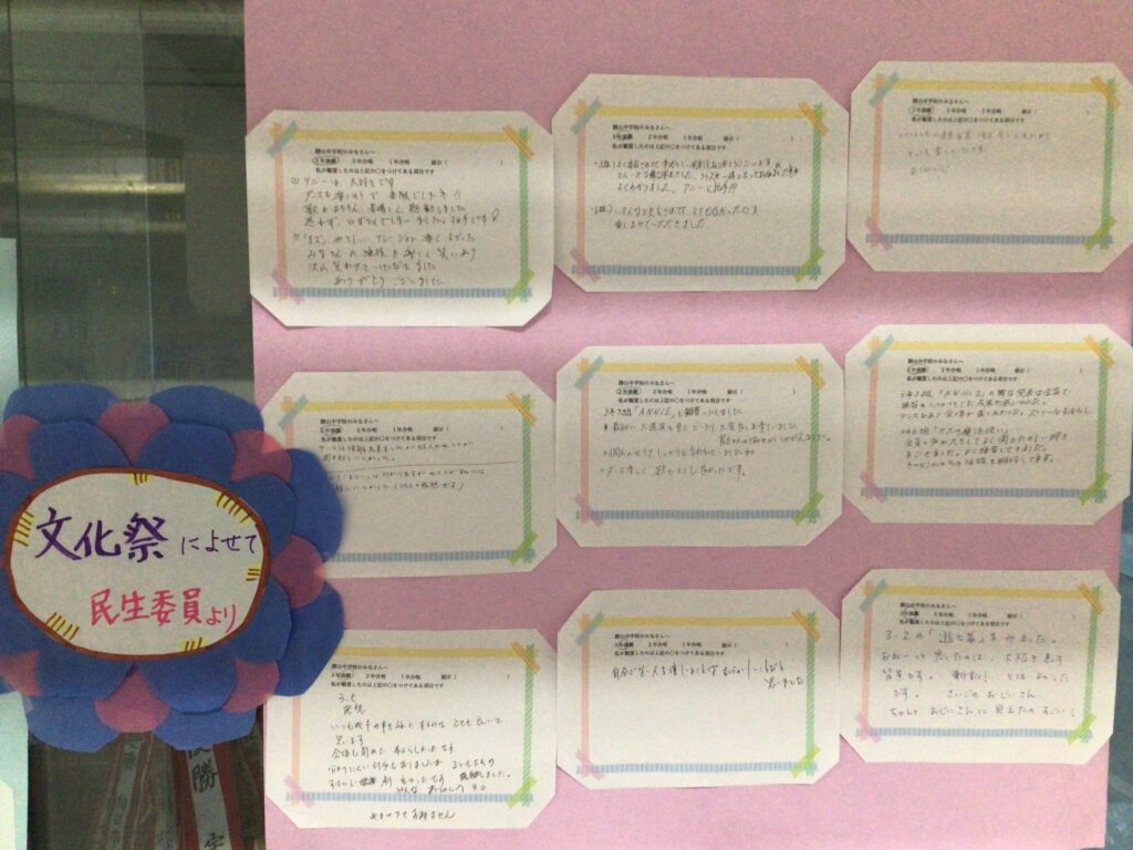 2日間にわたる文化祭では、美術部・理科部の頑張りも随所に見られました。 また、向日が丘支援学校の生徒のみなさんからの作品も本校の教科や総合的な学習の 作品と一緒に展示させていただきました。 2日目の午後からの吹奏楽部による発表では、部員のかわいいダンスに、 ゲスト指揮者(!?)の登場もあり、演奏者と観客が一体化して大いに盛り上がりました。 なお、二日間にわたって文化祭を見に来ていただいた民生委員さんによる 勝中生への嬉しいメッセージも頂戴しております。 お忙しい中、ご来校いただきありがとうございました。