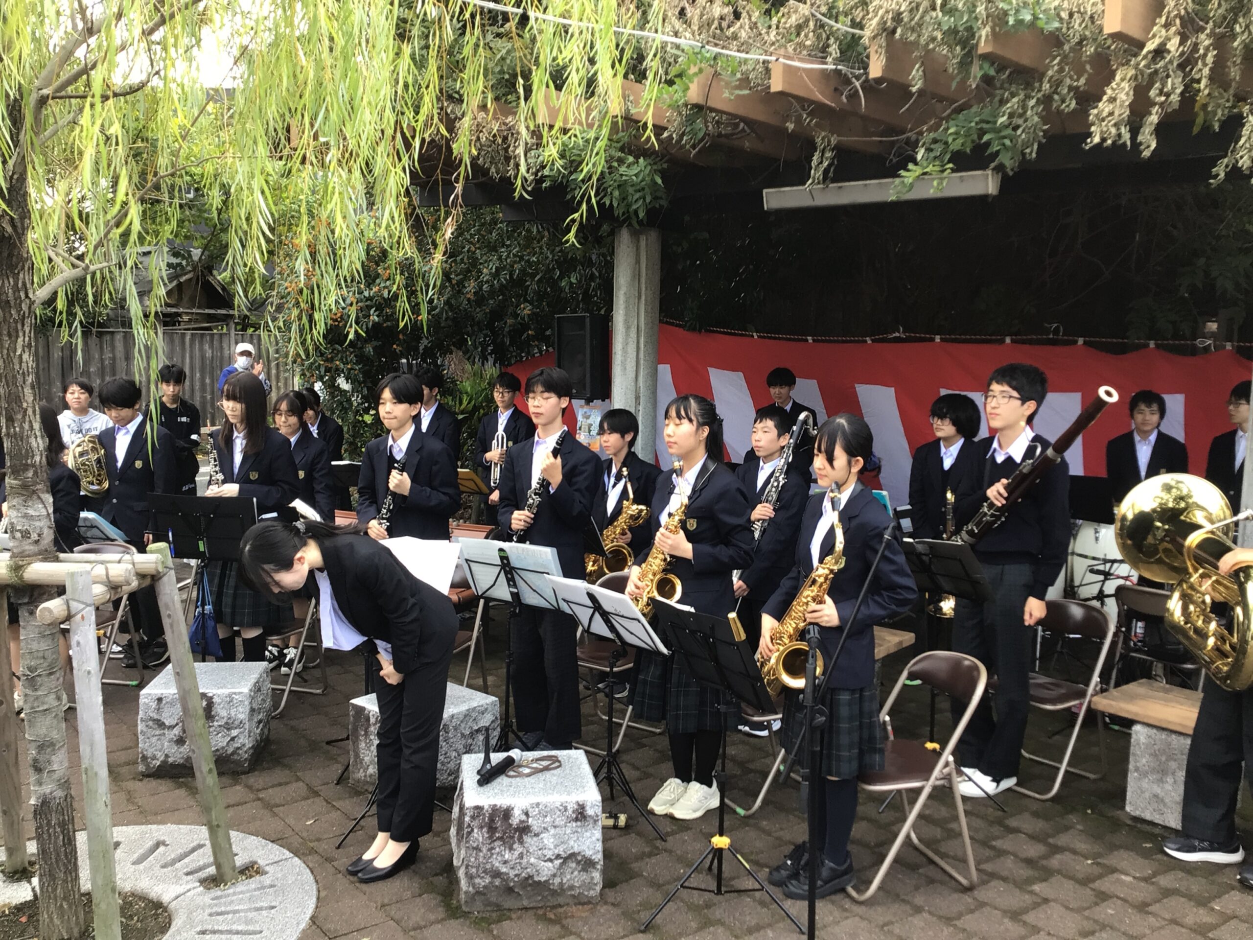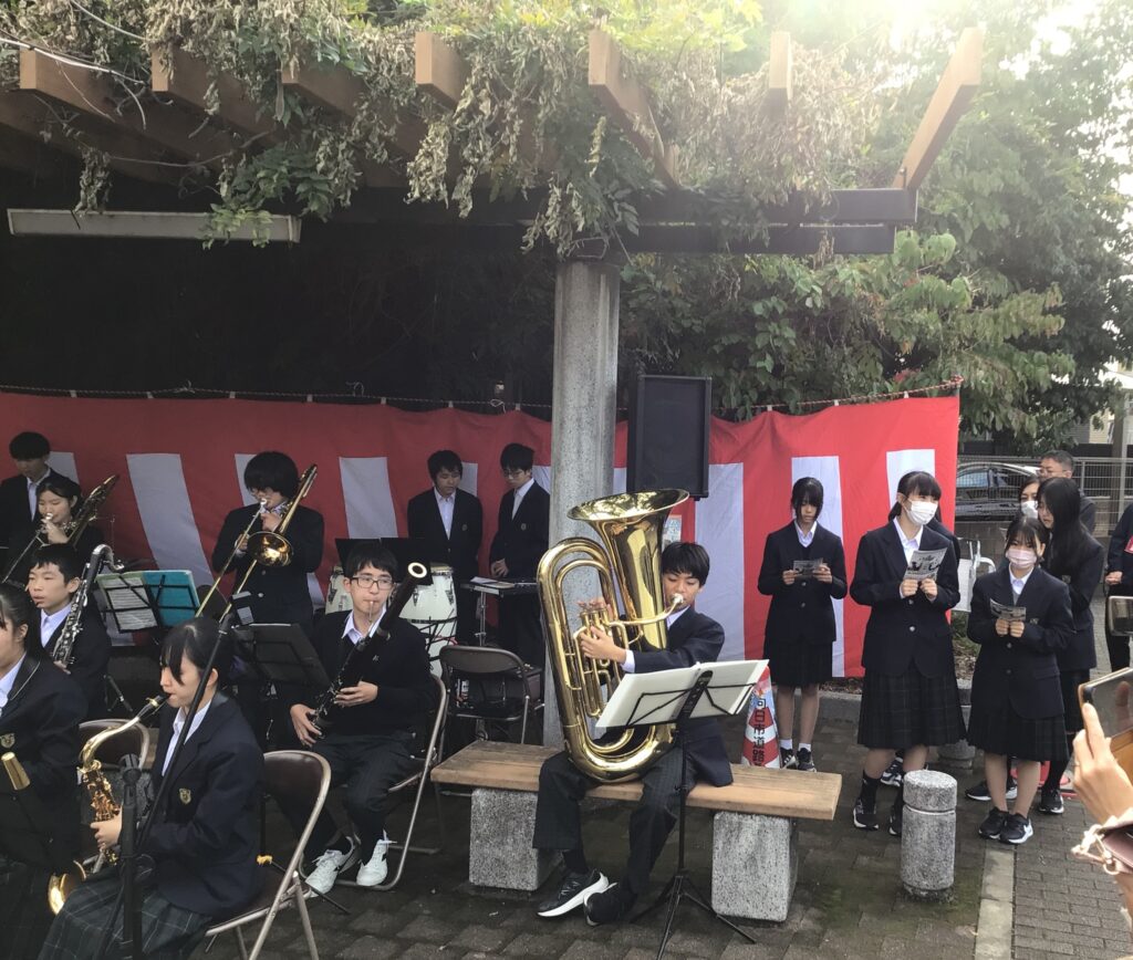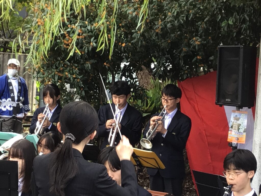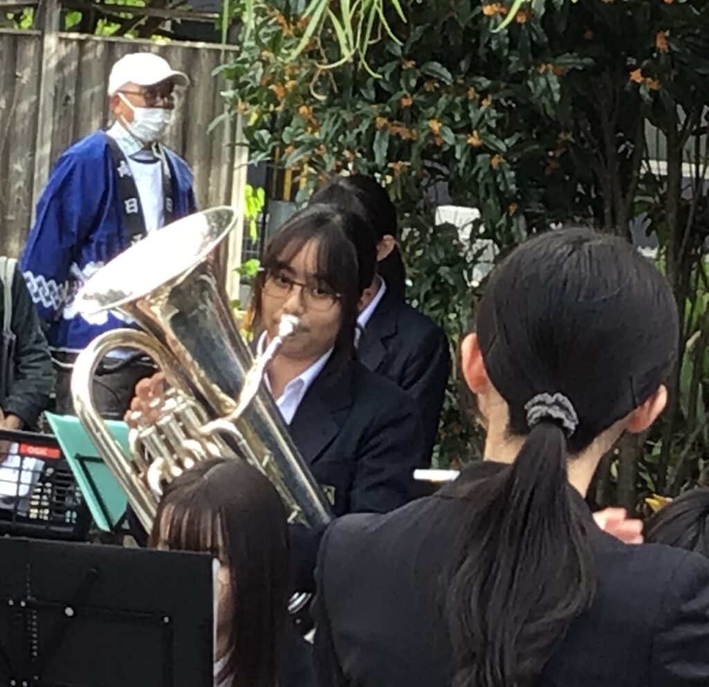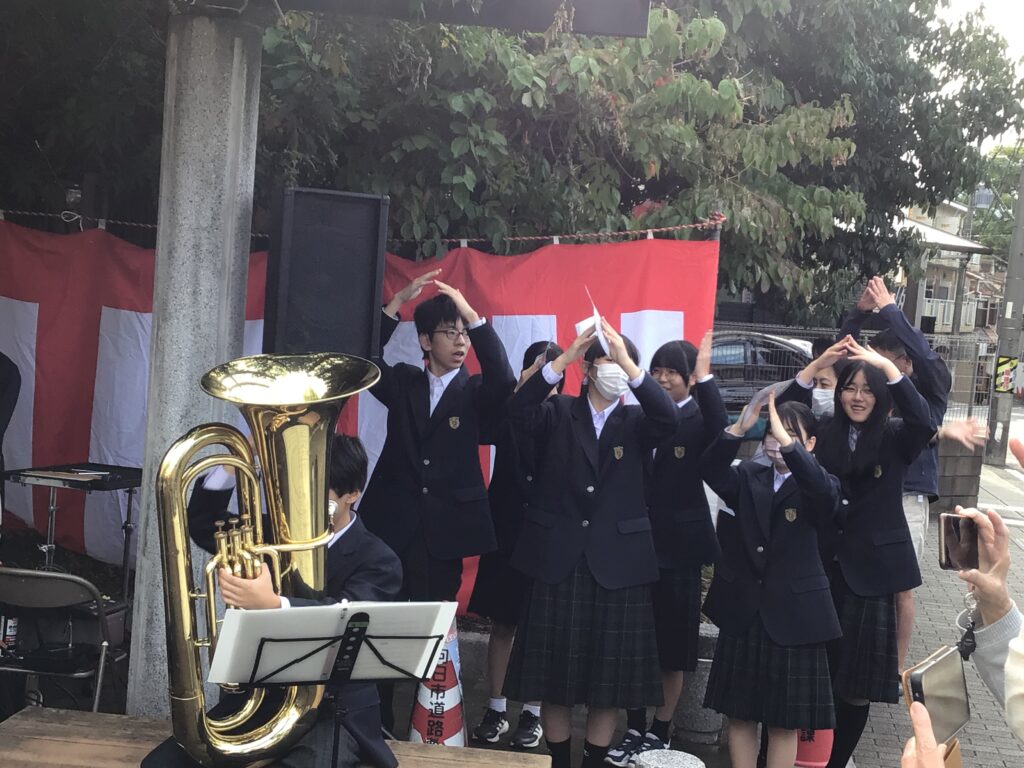 今日は、五辻常夜灯まつりに本校の吹奏楽部が招待を受けて演奏しました。 本校から徒歩1分以内にある五辻常夜灯は、江戸時代に京都から柳谷観音へ行く 参拝者のために立てられ、重要な交通の拠点でした。 この五辻がポケットパークとして復元・整備され 現在では地域の憩いの場となっています。 向日市のシンボルの1つでもある「五辻常夜灯」の前で、 本校の吹奏楽部は、流行の曲からみなさんに知られている曲、 そして、地域のシンボルが後世にも続く思いを込めて「故郷」を演奏しました。 3年の先輩が引退してから新体制となりましたが、 文化祭での演奏、ひまわりフェスタ、五辻常夜灯まつりと3日間連続の演奏を通して、 目指す生徒像の1つである地域に【貢献】する堂々とした演奏でした。お疲れ様でした!