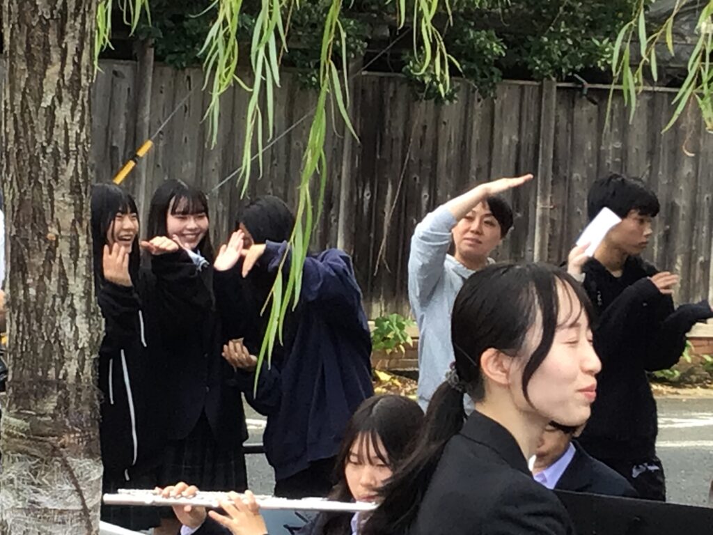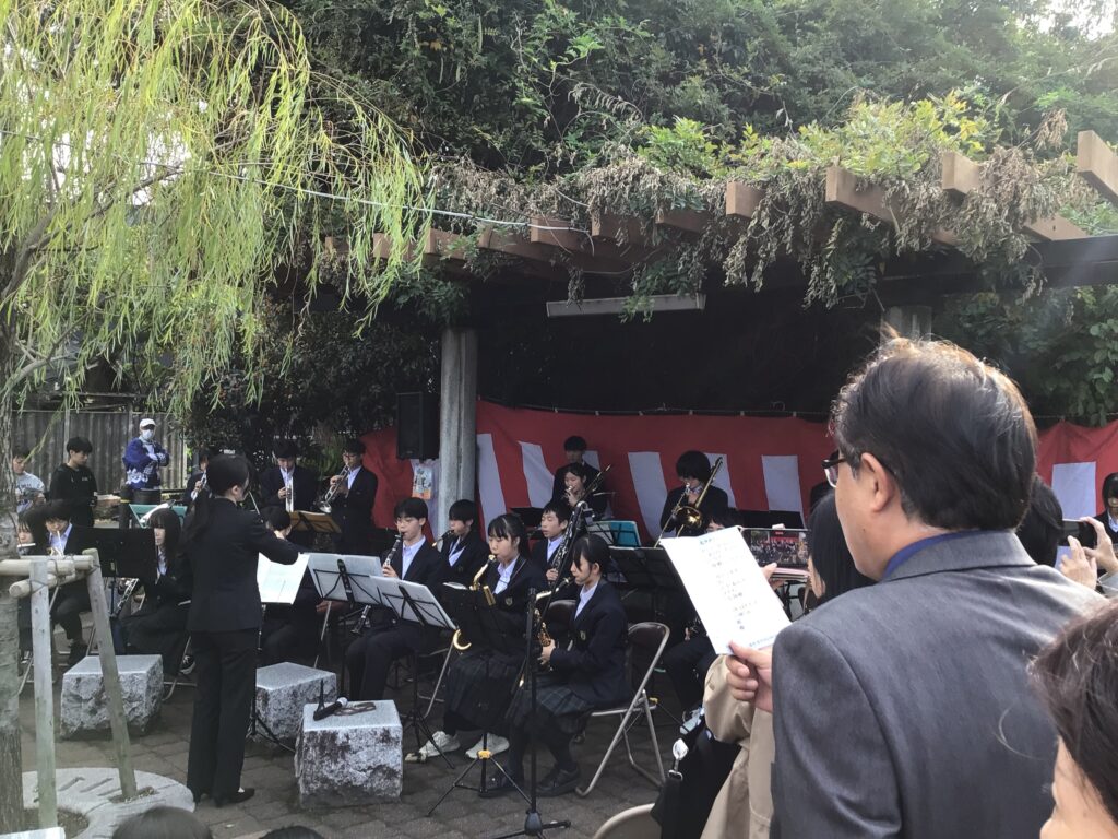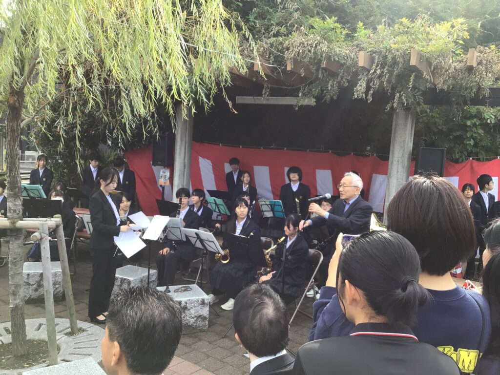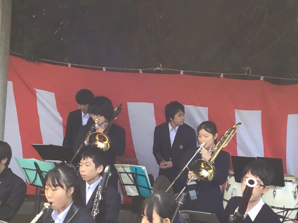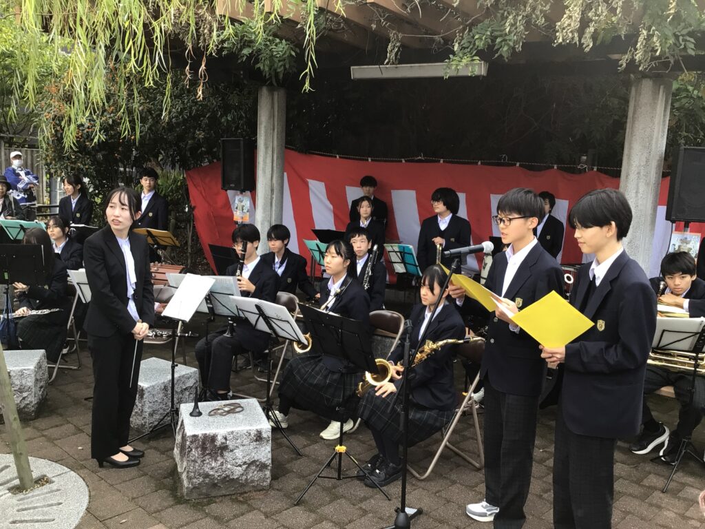 今日は、五辻常夜灯まつりに本校の吹奏楽部が招待を受けて演奏しました。 本校から徒歩1分以内にある五辻常夜灯は、江戸時代に京都から柳谷観音へ行く 参拝者のために立てられ、重要な交通の拠点でした。 この五辻がポケットパークとして復元・整備され 現在では地域の憩いの場となっています。 向日市のシンボルの1つでもある「五辻常夜灯」の前で、 本校の吹奏楽部は、流行の曲からみなさんに知られている曲、 そして、地域のシンボルが後世にも続く思いを込めて「故郷」を演奏しました。 3年の先輩が引退してから新体制となりましたが、 文化祭での演奏、ひまわりフェスタ、五辻常夜灯まつりと3日間連続の演奏を通して、 目指す生徒像の1つである地域に【貢献】する堂々とした演奏でした。お疲れ様でした!