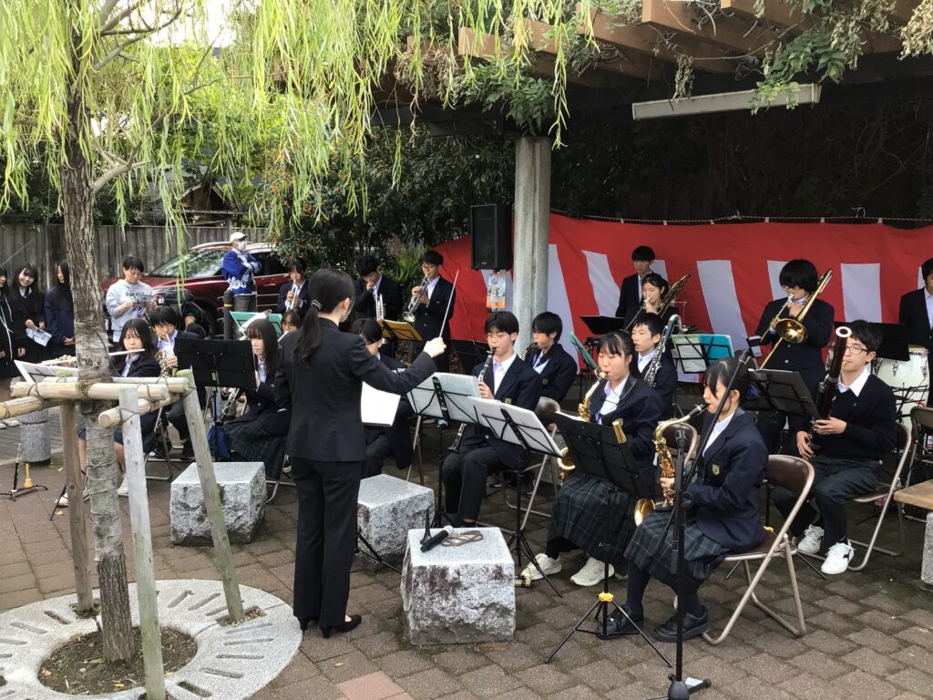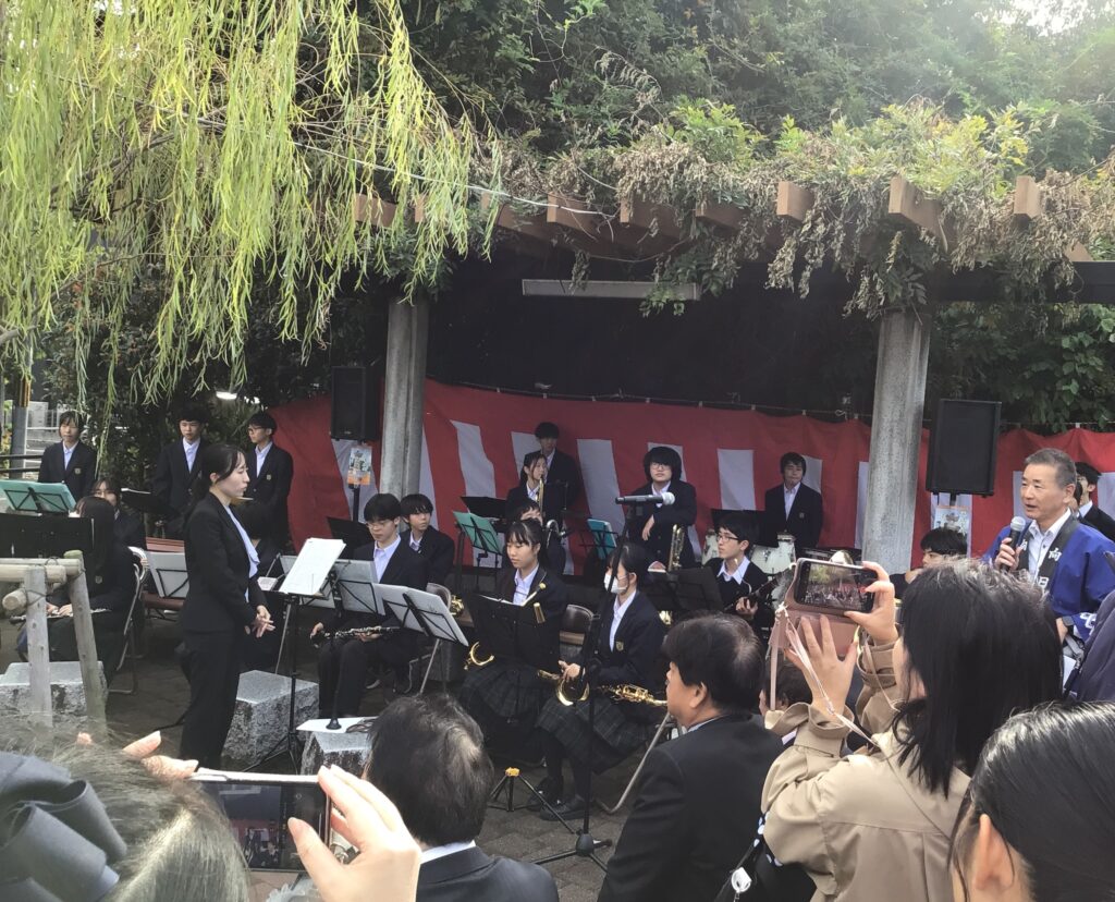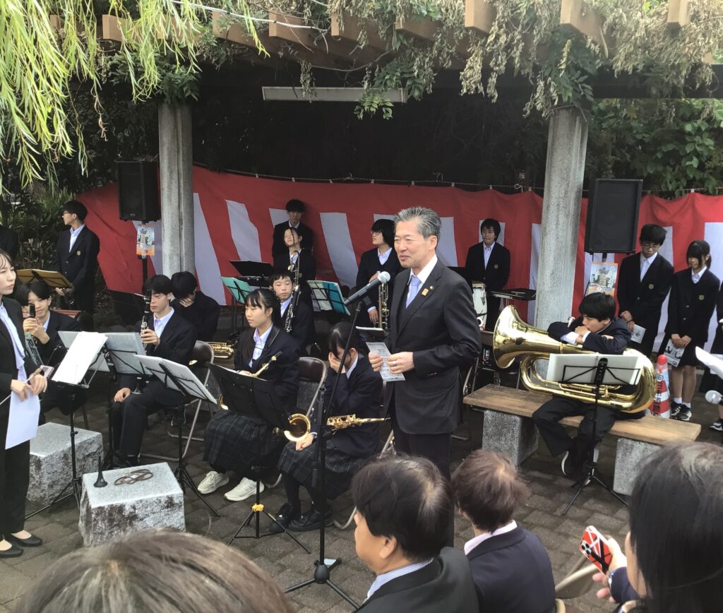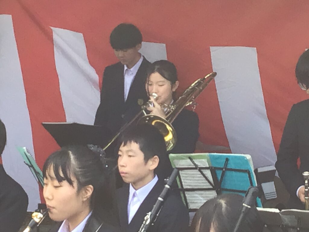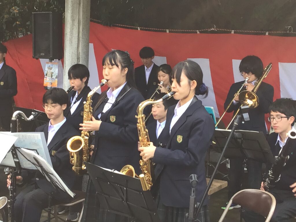 今日は、五辻常夜灯まつりに本校の吹奏楽部が招待を受けて演奏しました。 本校から徒歩1分以内にある五辻常夜灯は、江戸時代に京都から柳谷観音へ行く 参拝者のために立てられ、重要な交通の拠点でした。 この五辻がポケットパークとして復元・整備され 現在では地域の憩いの場となっています。 向日市のシンボルの1つでもある「五辻常夜灯」の前で、 本校の吹奏楽部は、流行の曲からみなさんに知られている曲、 そして、地域のシンボルが後世にも続く思いを込めて「故郷」を演奏しました。 3年の先輩が引退してから新体制となりましたが、 文化祭での演奏、ひまわりフェスタ、五辻常夜灯まつりと3日間連続の演奏を通して、 目指す生徒像の1つである地域に【貢献】する堂々とした演奏でした。お疲れ様でした!