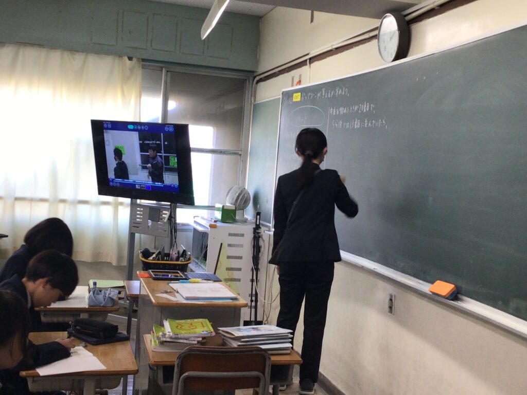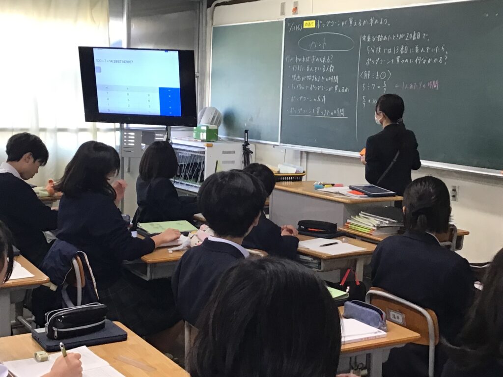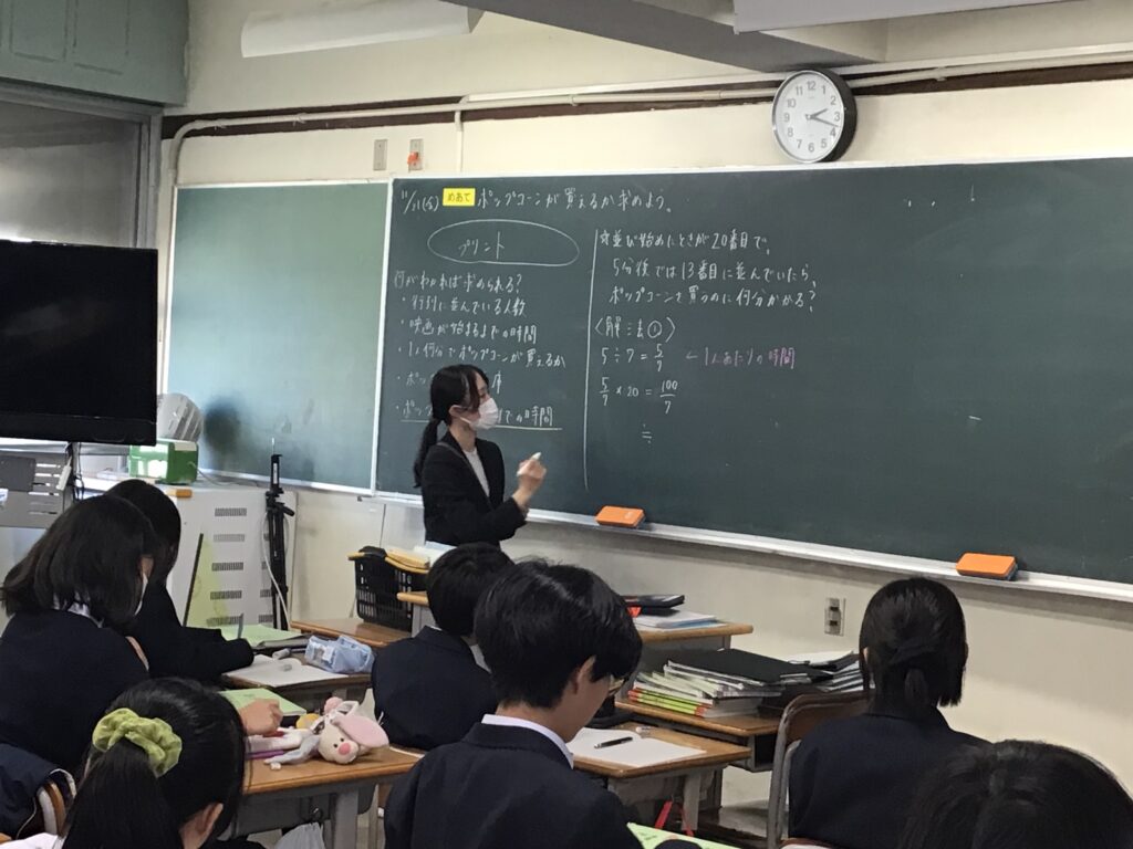 学校日誌1年の数学科では、比例・反比例の利用で、 「映画が始まるまでにポップコーンは食べられるのか?」という映像課題から 子どもたちと「どのようなことがわかればポップコーンを買えるか」 の見通しを持ち、課題解決に向けて複数の解法を考えました。 この課題を通して、現実問題について、仮定(みなす)を置くことによって、 数学を用いて解決するよさを実感することができました。